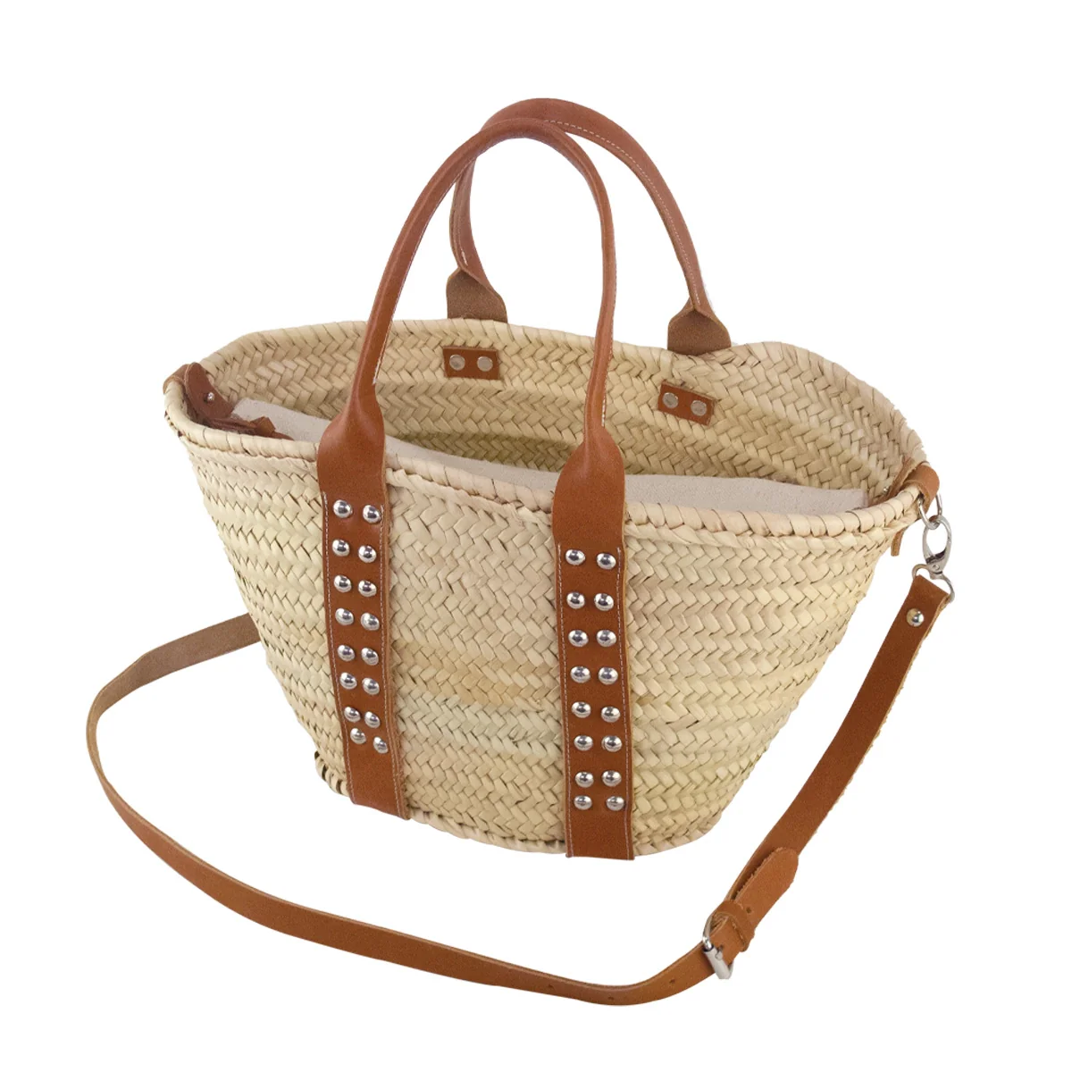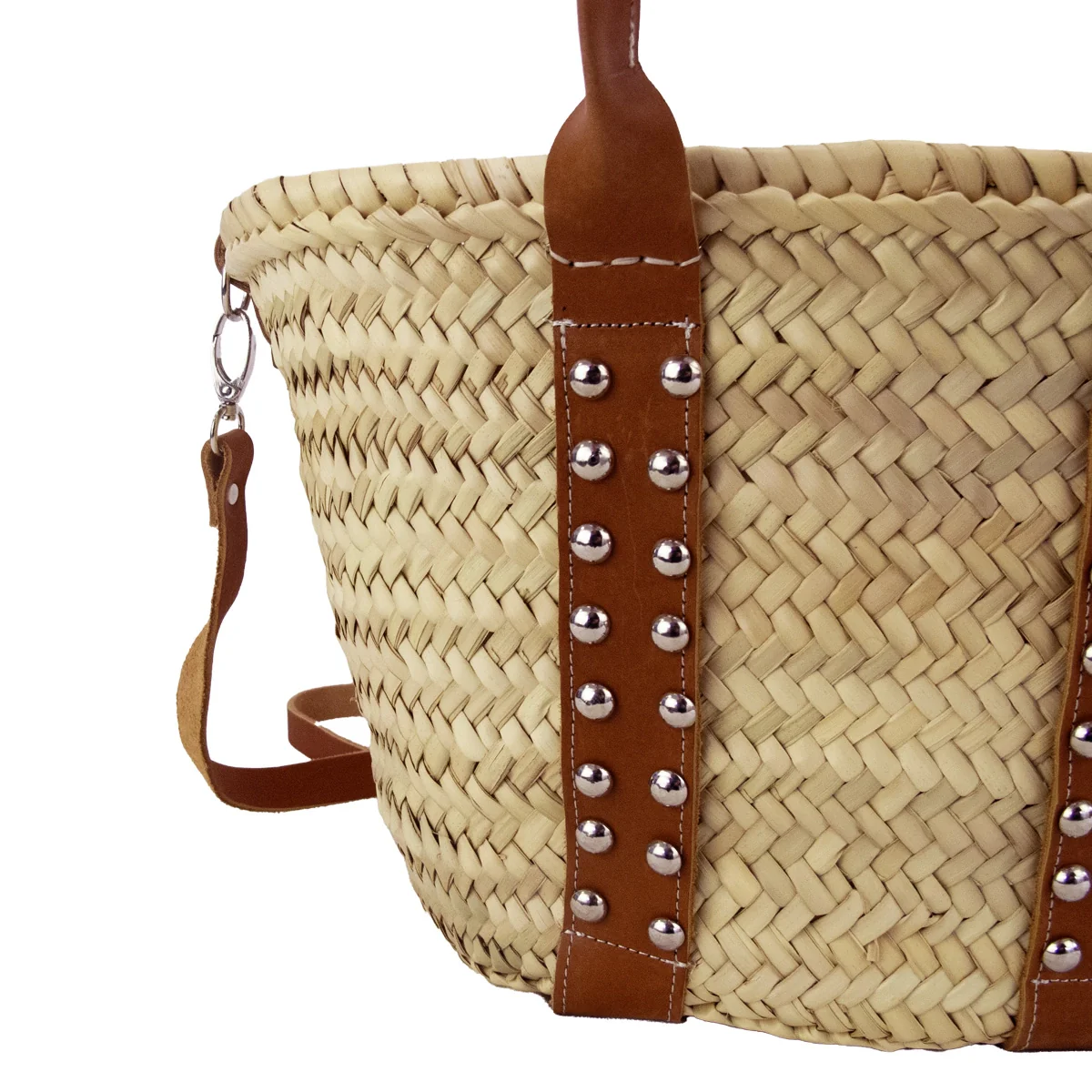 Le couffin marocain chic et tendance de cet été Découvrez Assia, un petit couffin marocain tressé à la main avec des clous décoratifs. Avec ses poignées en cuir, sa longue anse et sa poche à zip détachable, il offre un look tendance et moderne. Craquer pour ce panier marocain tendance et élégant !