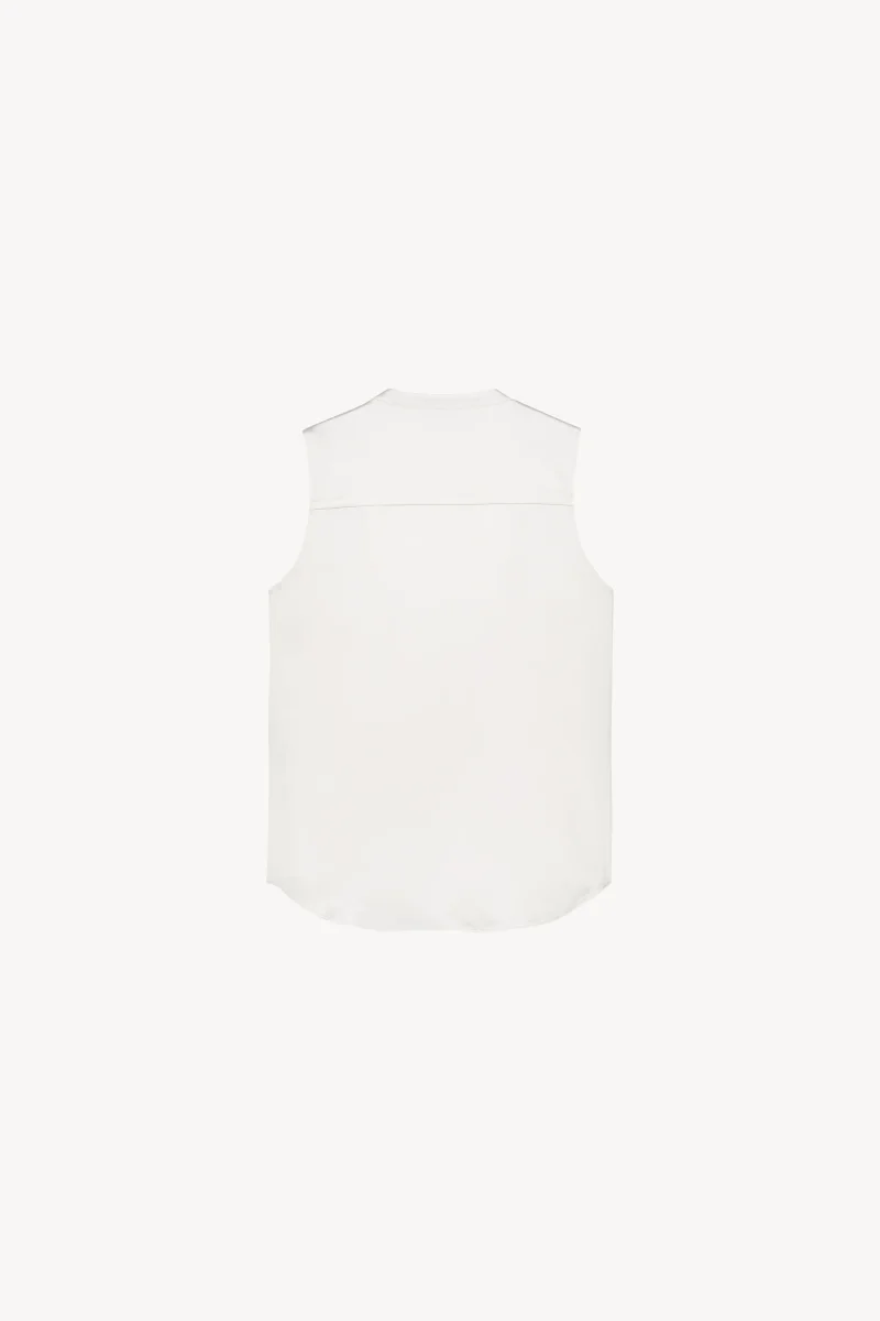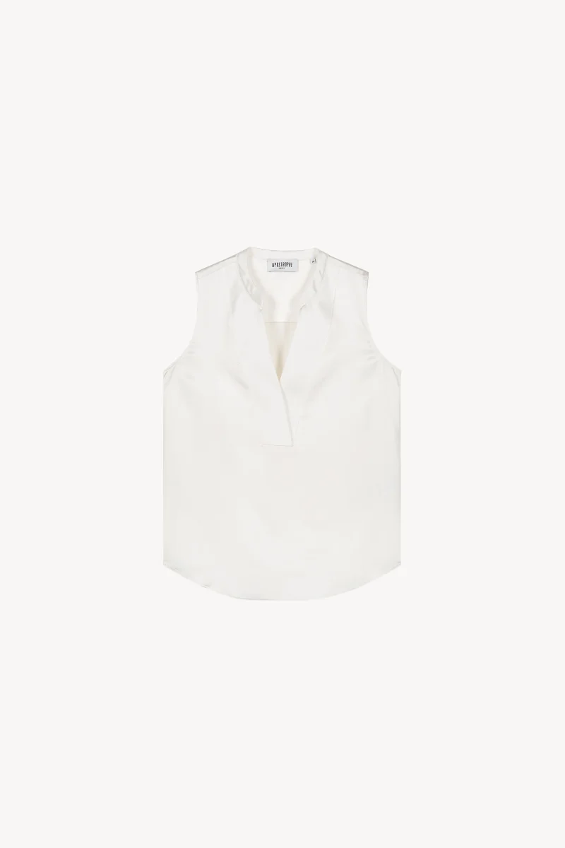 Cette blouse sans manches blanche présente un col officier ouvert habillant parfaitement votre port de tête. Les boutons à pressions invisibles permettent un enfilage facile et rapide, tandis que le bas arrondi offre une silhouette flatteuse. Sa soie de haute qualité lui confère un toucher agréable pour un confort inégalé. Cette blouse est la pièce polyvalente parfaite pour une tenue de bureau chic ou une soirée décontractée.