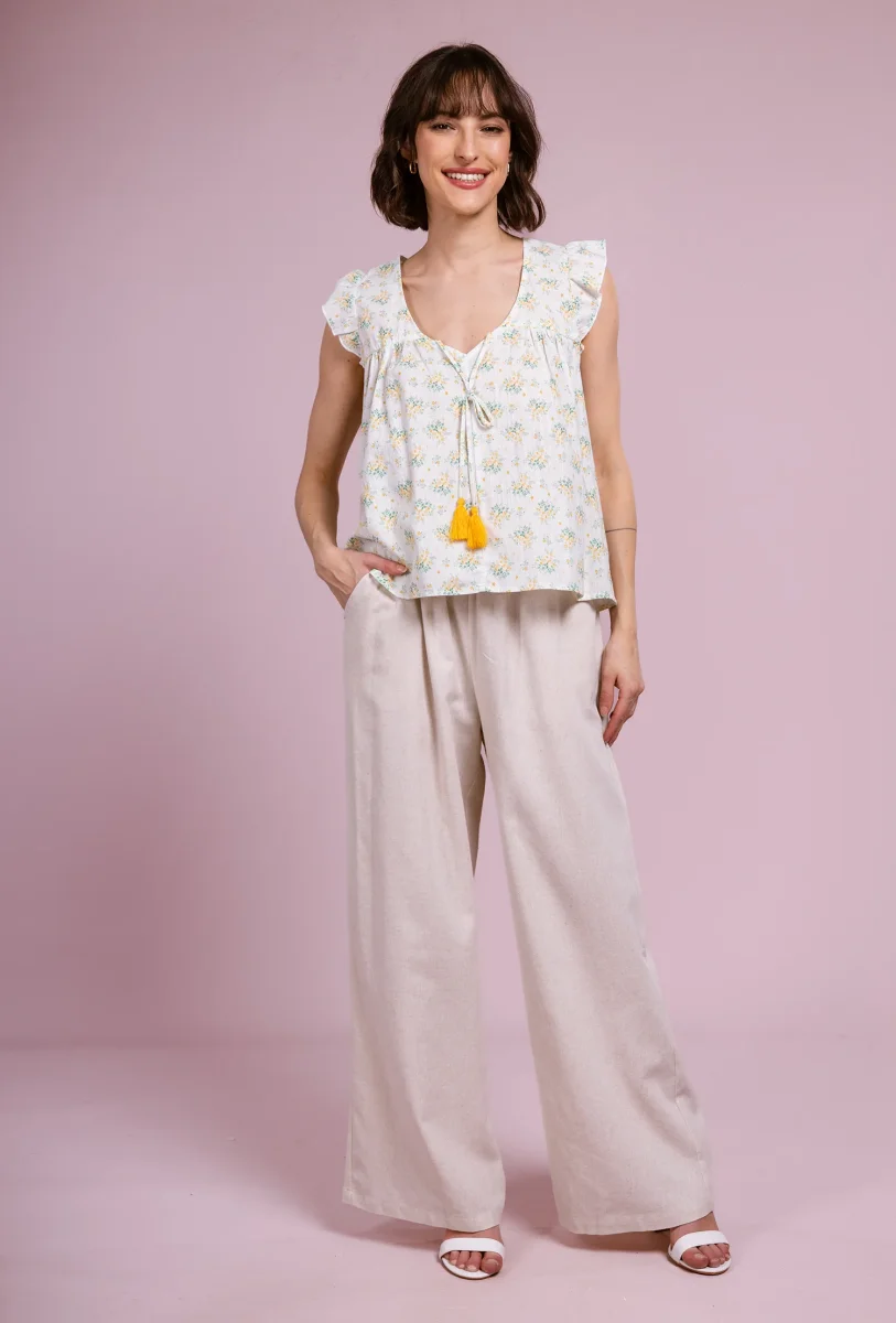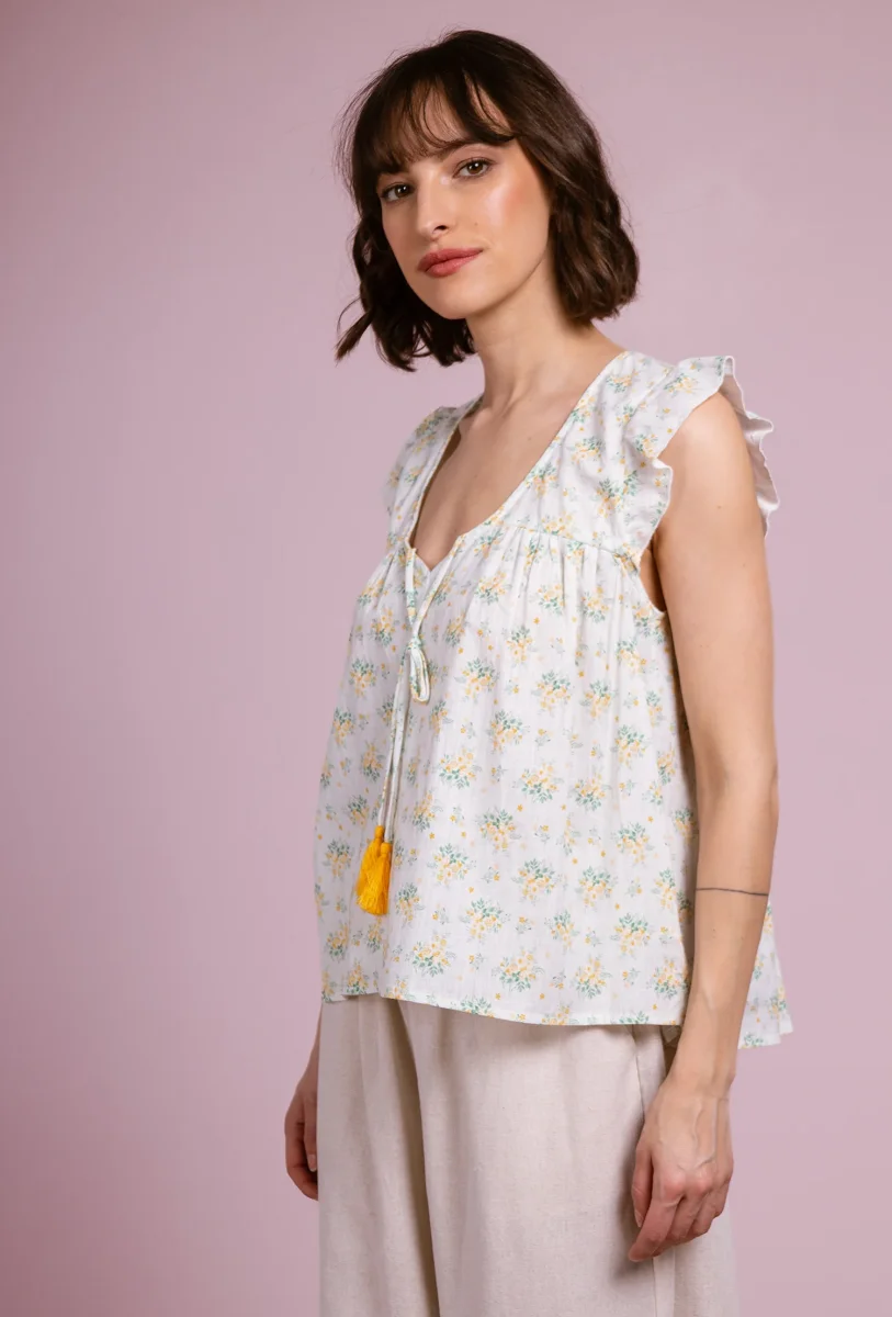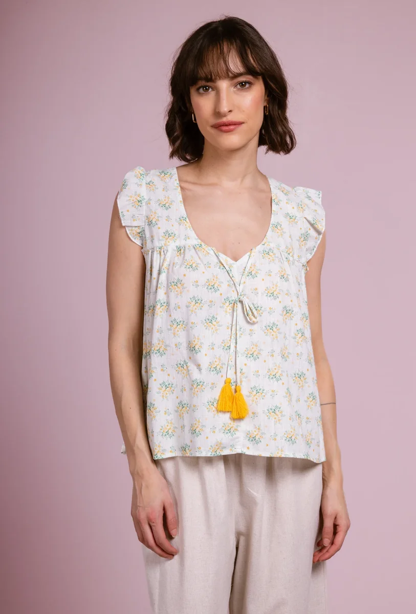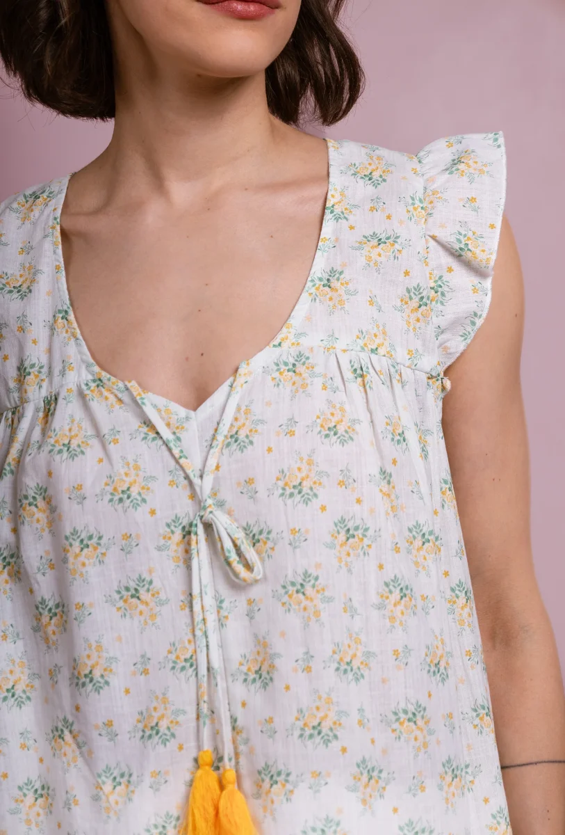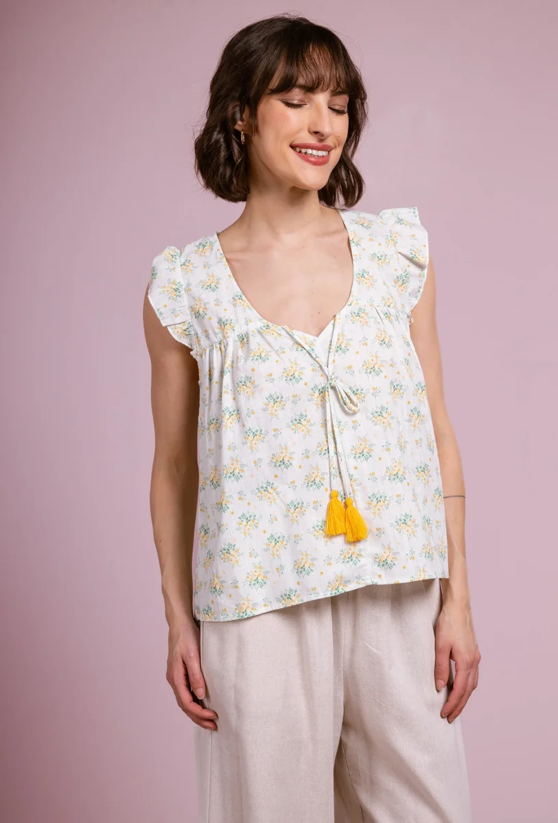 Blouse Etienne • Sans manches • Col V avec lien • Volants aux épaules Matière & EntretienLa blouse est composée à 100% de coton.Préférez un lavage en machine à 30°, programme délicat.Séchage et repassage à faible température.
