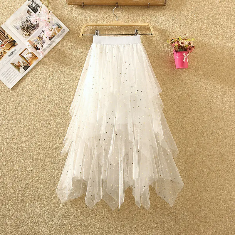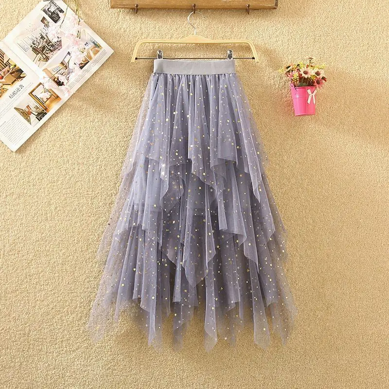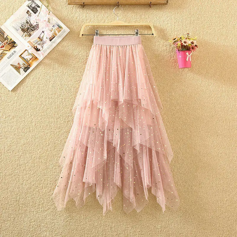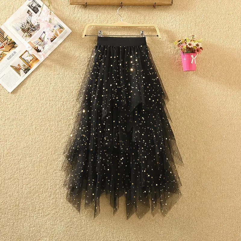 Pour un look de princesse des temps moderne optez pour notre jupe à volants asymétrique à paillettes. Une jupe mi-longue qui vous donnera une allure chic et festive en toutes circonstances. Idéale de jour comme de nuit.