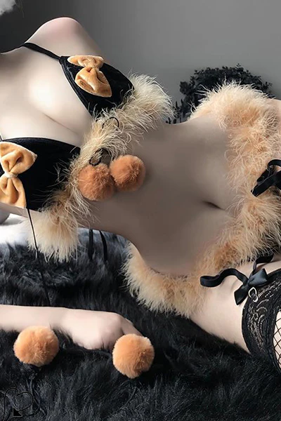 La particularité de la lingerie Soubrette Coquine se situe sur la diversité de ces accessoires ornementale. Parsemée de moumoute de couleur marron, la magnifique lingerie Soubrette Coquine est également ornée de petite boule en peluche située sur le collier, l’arrière du string et sur la coiffe. En outre, le plus alléchant se trouve sur les deux petits cœurs blancs fixés sur la devanture dudit string noir. D’un autre côté, les deux nœuds papillon posés de part et d’autre sur le devant du soutien-gorge témoignent également de son originalité et de son style canon.