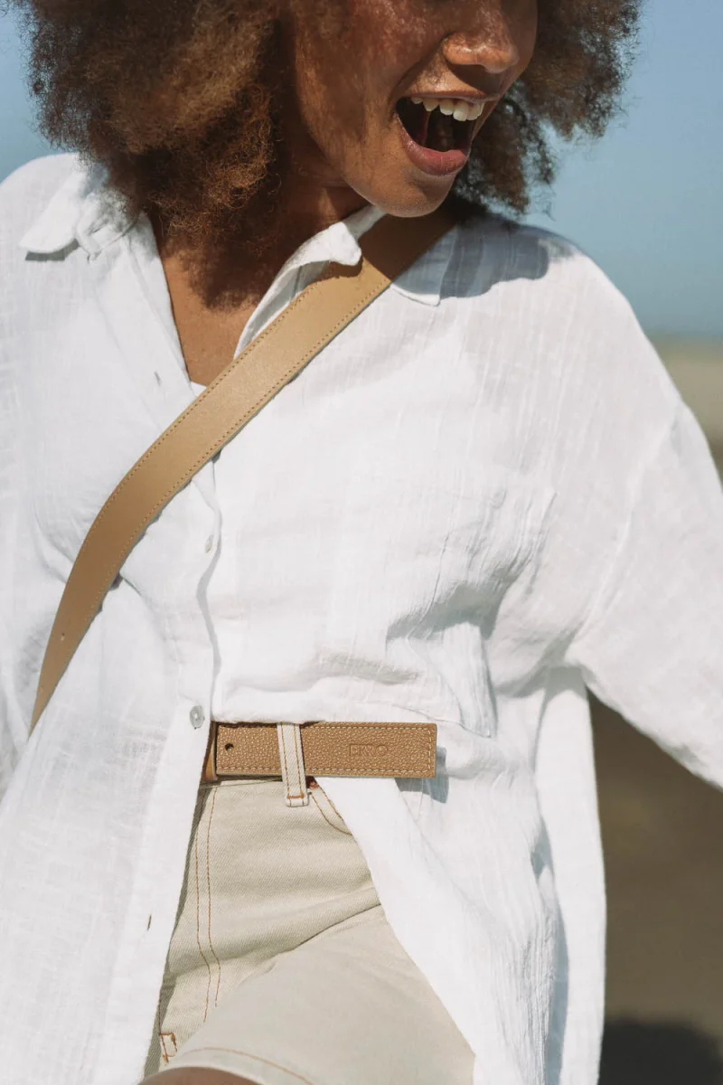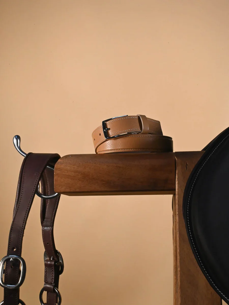 La ceinture ORHY Sable est l’incarnation d’une élégance discrète et intemporelle. Inspirée par les lignes de la sellerie traditionnelle, elle se distingue par son légèrement bombé subtil et sa boucle rectangulaire en métal, pour un rendu à la fois structuré, sobre et raffiné.