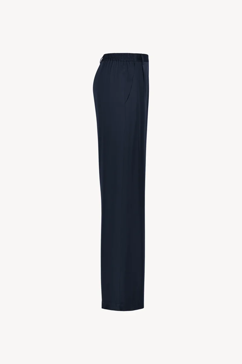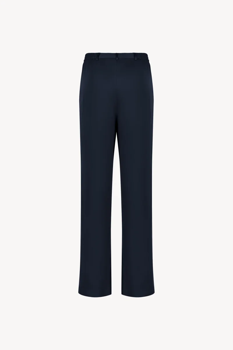 Ce pantalon droit marine représente un intemporelle de votre garde-robe. Dote d’une ceinture élastique avec des détails côtelés, ce pantalon offre un ajustement parfait à votre silhouette. Les détails froncés à l’avant et à l’arrière ajoutent une touche de finition sophistiquée. Son tissu en soie est doté d’une grande souplesse, créant une liberté de mouvement sans limite. A la fois léger et agréable, ce pantalon sublimera sans aucun doute votre silhouette.