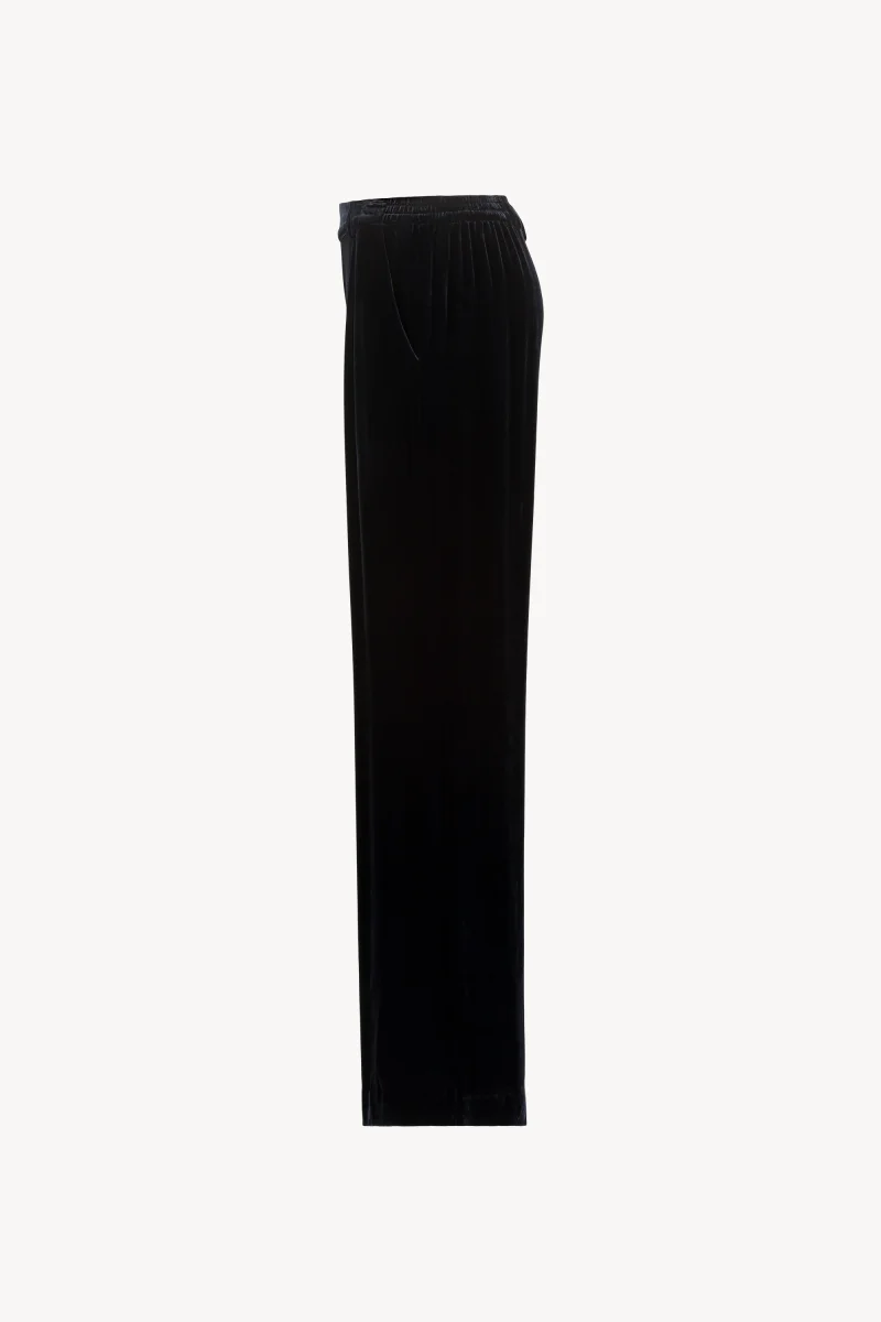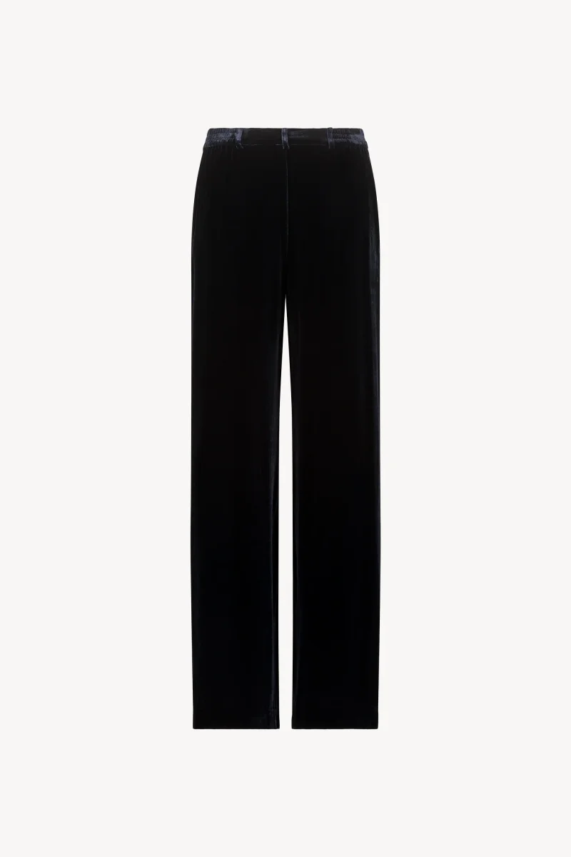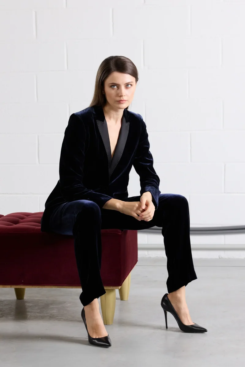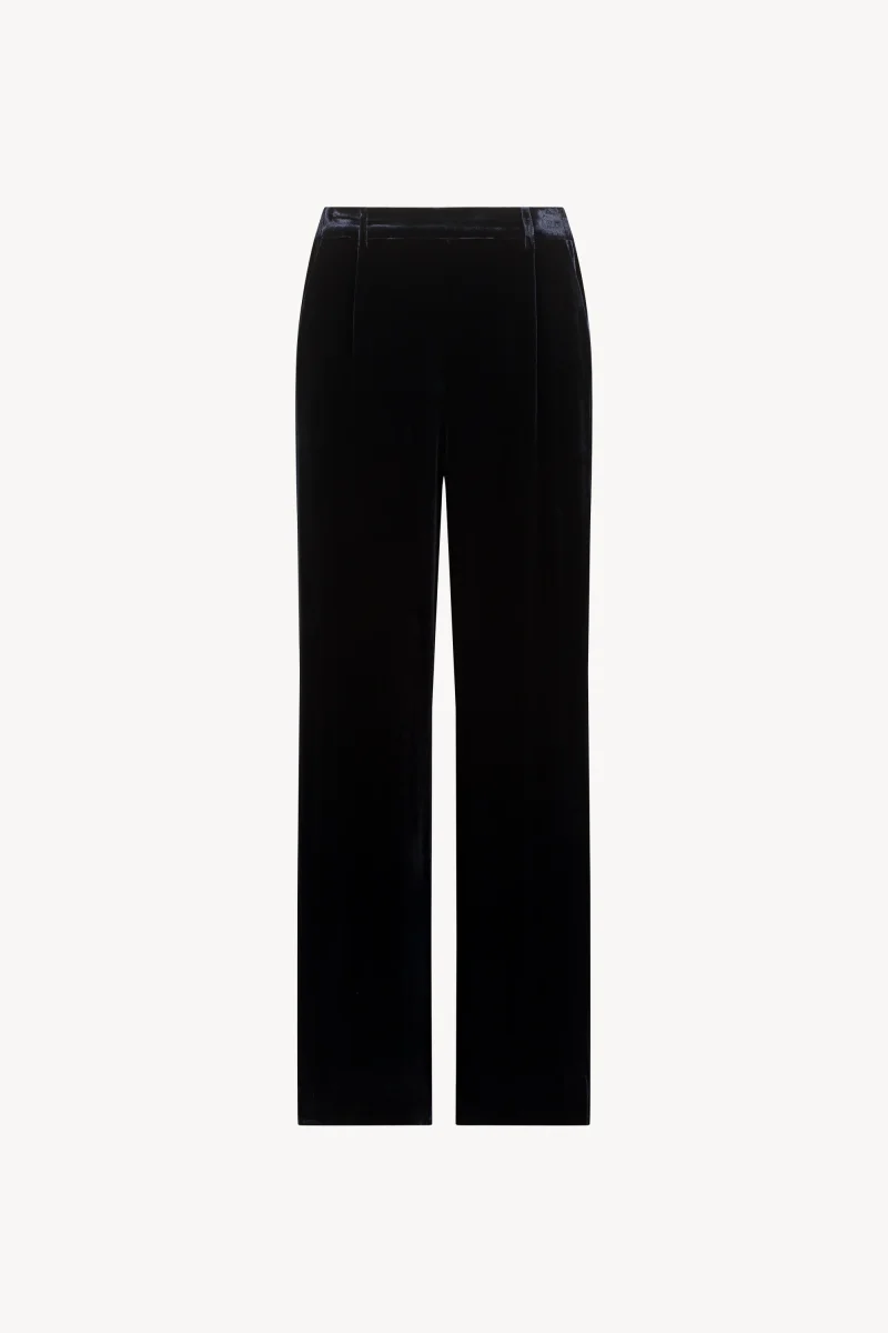 Élégant et raffiné, ce pantalon droit en velours de soie bleu marine vous offre un confort absolu et un style intemporel. La taille élastique sur les côtés et les poches italiennes viennent sublimer sa coupe impeccable, tandis que les plis sur le devant ajoutent une touche sophistiquée à ce modèle.