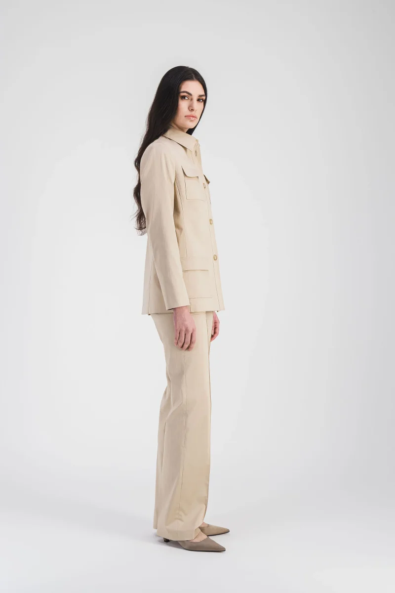 Ce pantalon évasé en satin de coton beige incarne l’élégance naturelle avec une touche de modernité. Sa coupe fluide et sa teinte douce créent une silhouette harmonieuse, idéale pour des looks chics. Conçu pour allier style et aisance, il s’associe parfaitement avec des tons neutres ou des touches de couleur.