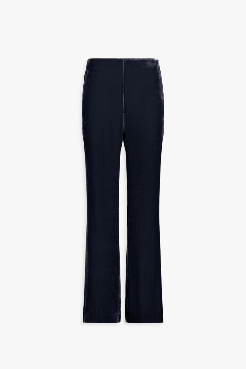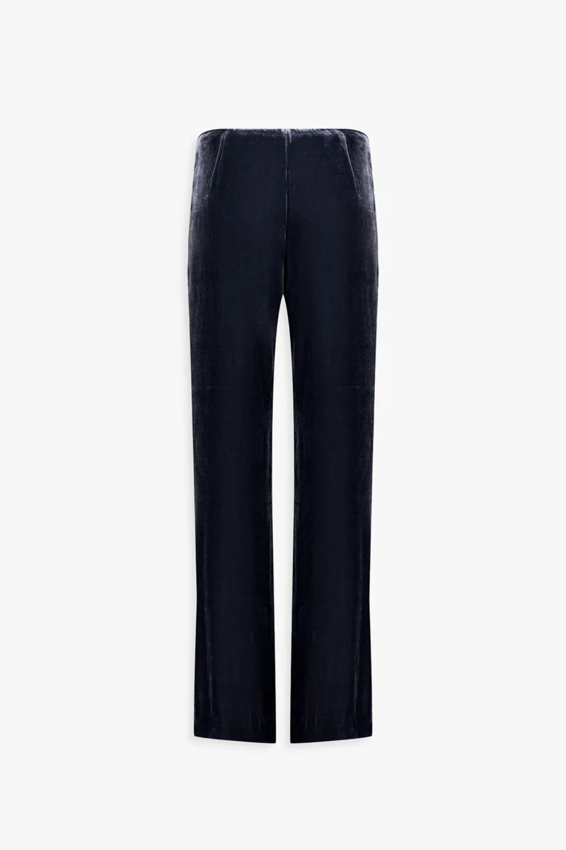Ce pantalon évasé en velours marine se distingue par la fluidité de sa ligne et la profondeur de sa teinte. Les plis marqués structurent la silhouette tandis que l’absence de poches préserve une allure épurée. Idéal pour sublimer une blouse ou un blazer.