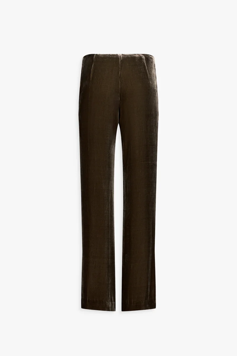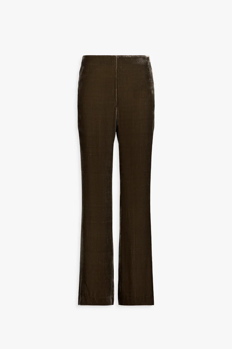 Ce pantalon évasé en velours taupe moyen révèle une élégance douce et nuancée. Sa coupe fluide et ses plis marqués sculptent la silhouette avec naturel, tandis que la texture veloutée joue subtilement avec la lumière.