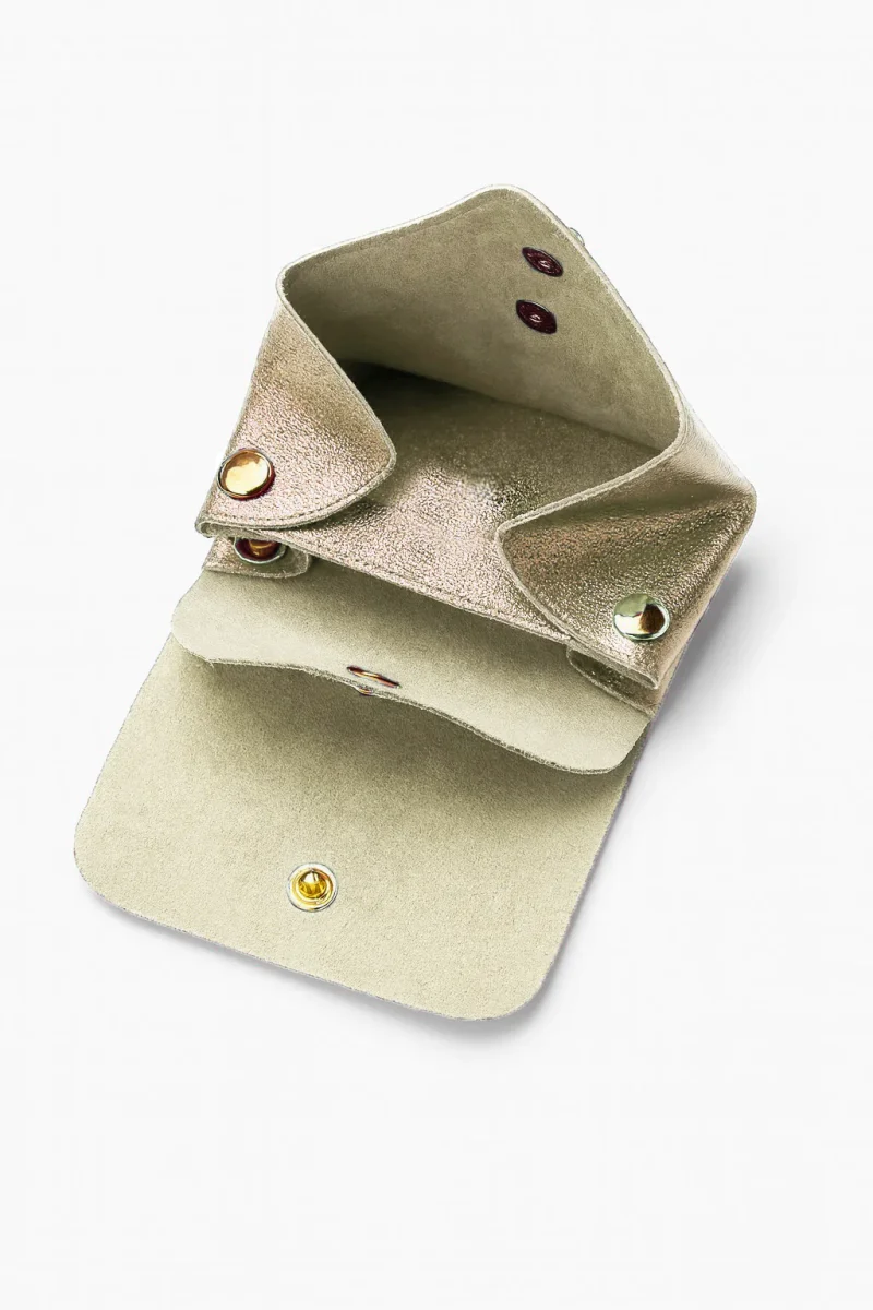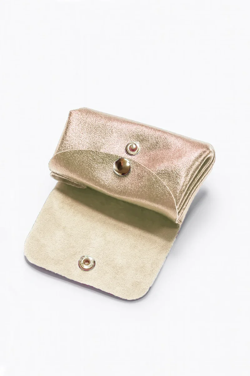 - Porte-monnaie forme accordéon en croûte de cuir de vachette métallisé.