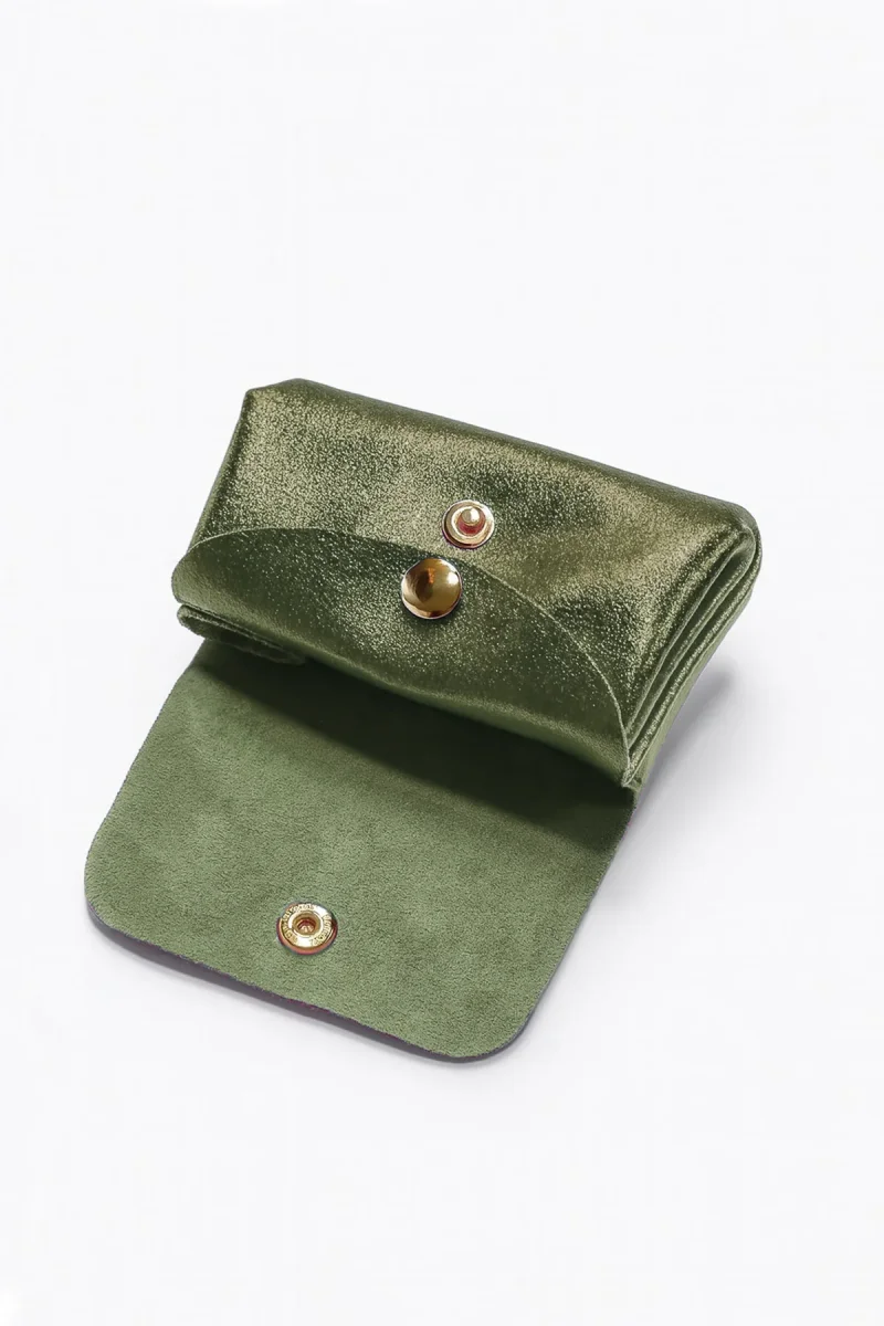 - Porte-monnaie forme accordéon en croûte de cuir de vachette métallisé.