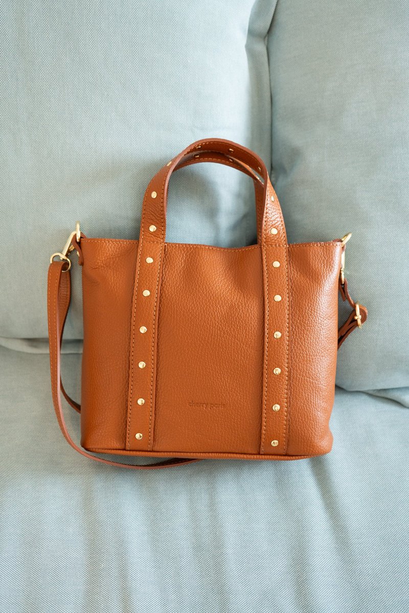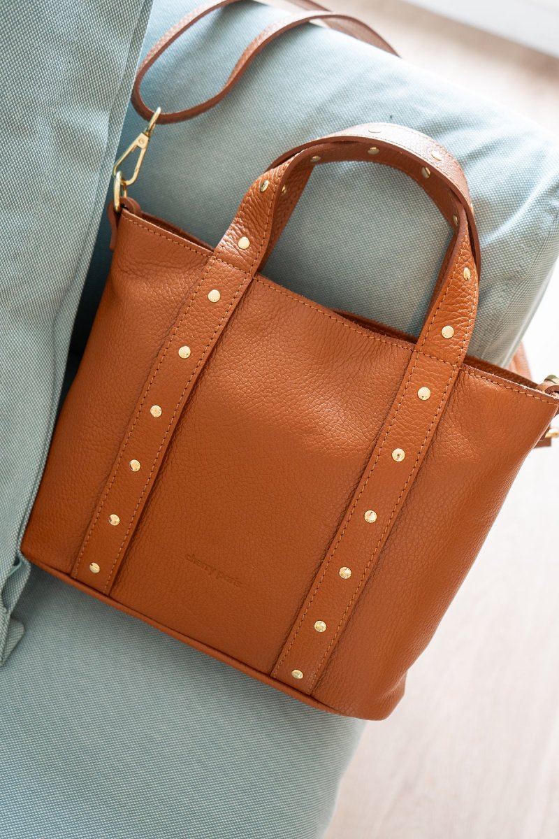 sac AIMEE Description Sac à main en cuir de vachette grainée. Bandes cloutées. Grande bandoulière réglable et amovible. Fermeture éclaire principale. Poche intérieure zippée. Dimension: 24,5x21x7,5cm Détails précieux Avec des clous bien placés, ce sac élégant est un choix idéal pour les occasions spéciales ou pour une tenue décontractée. Entretien Ne pas laisser son sac […]
