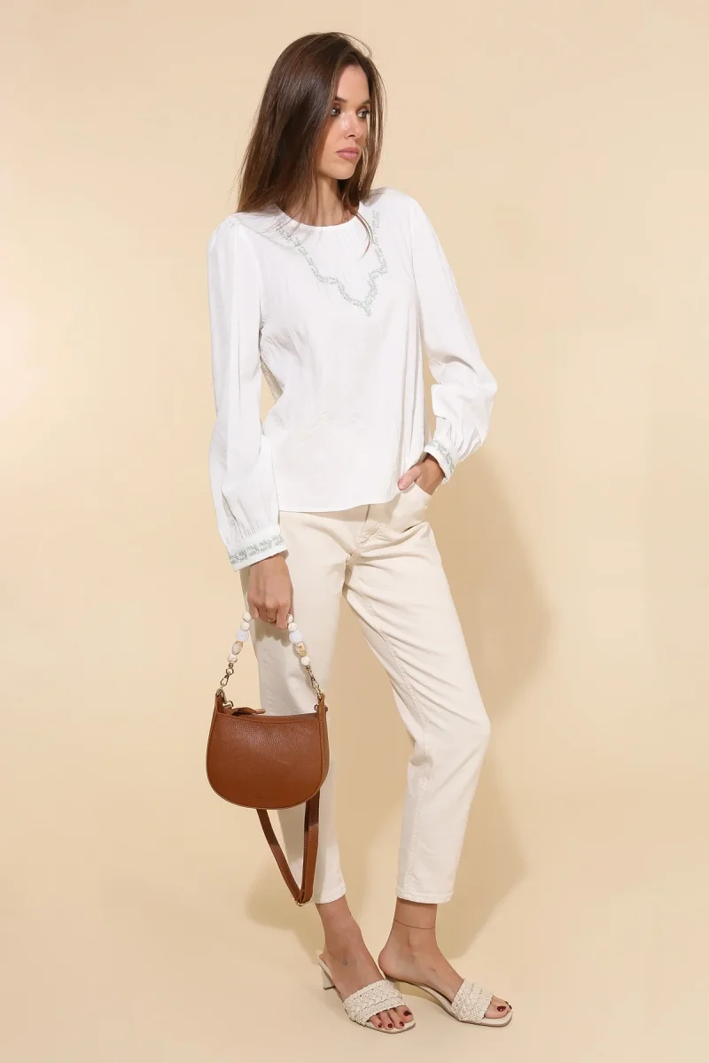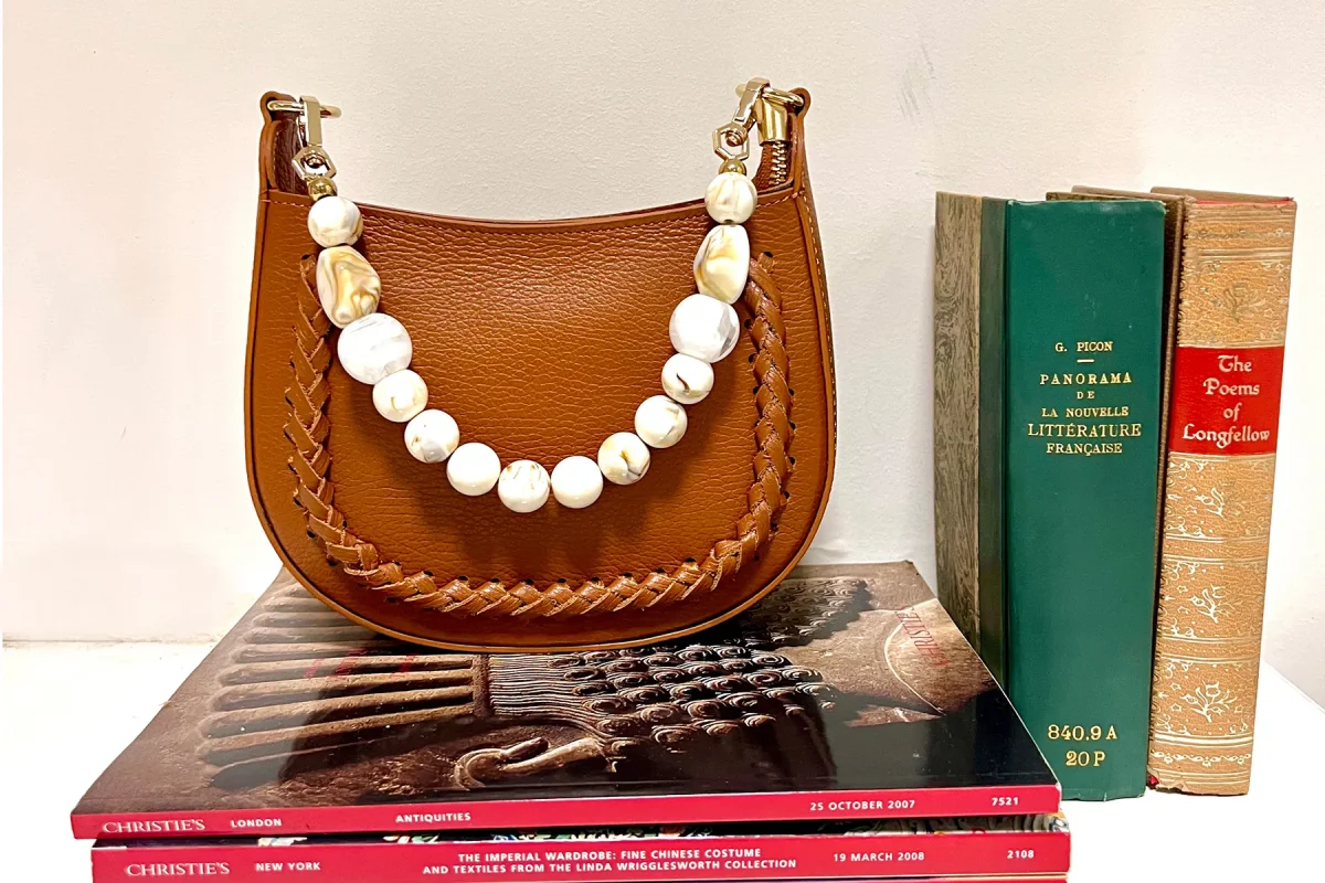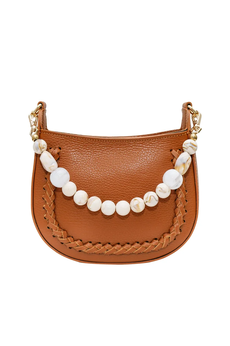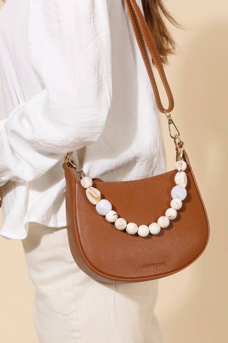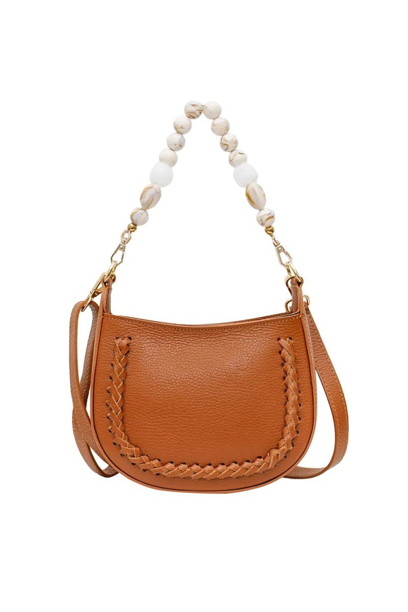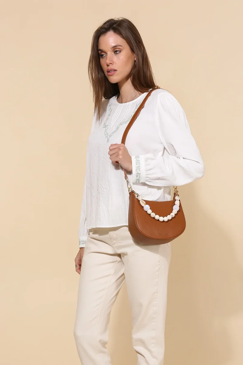 - Sac à main en cuir de vachette grainée avec poignée en perle amovible.