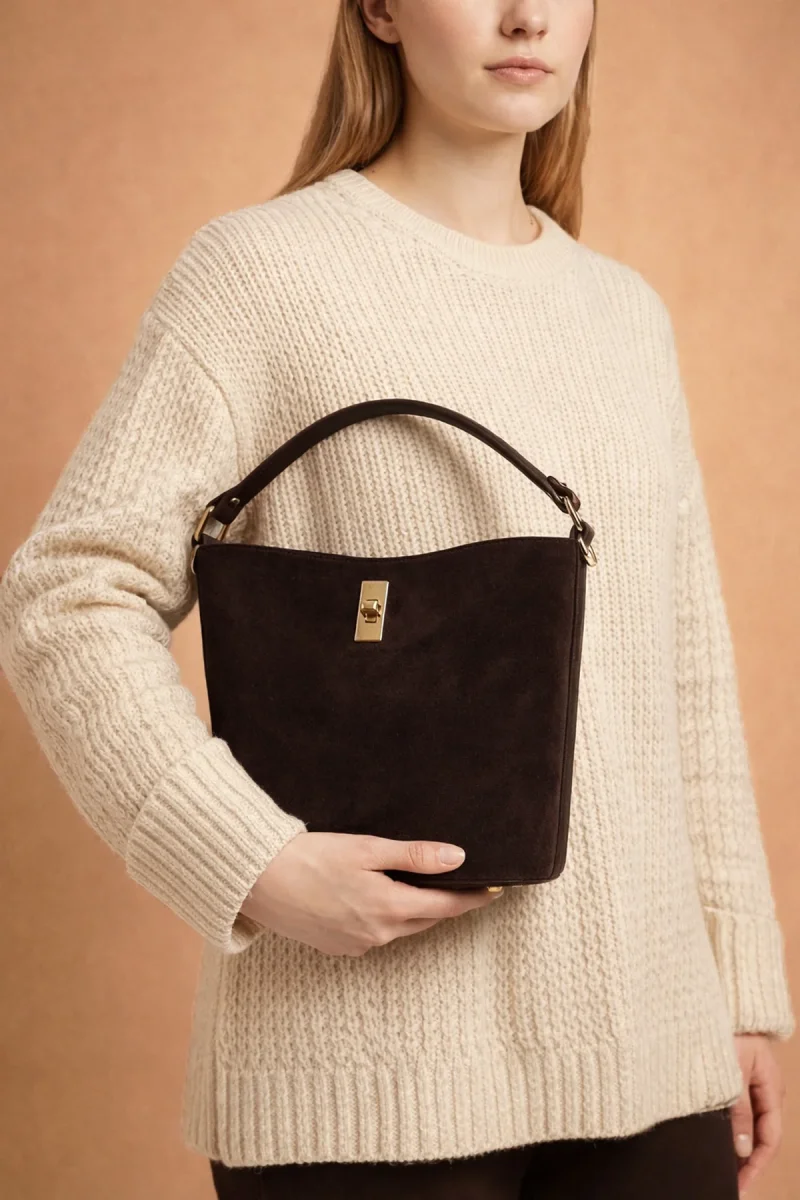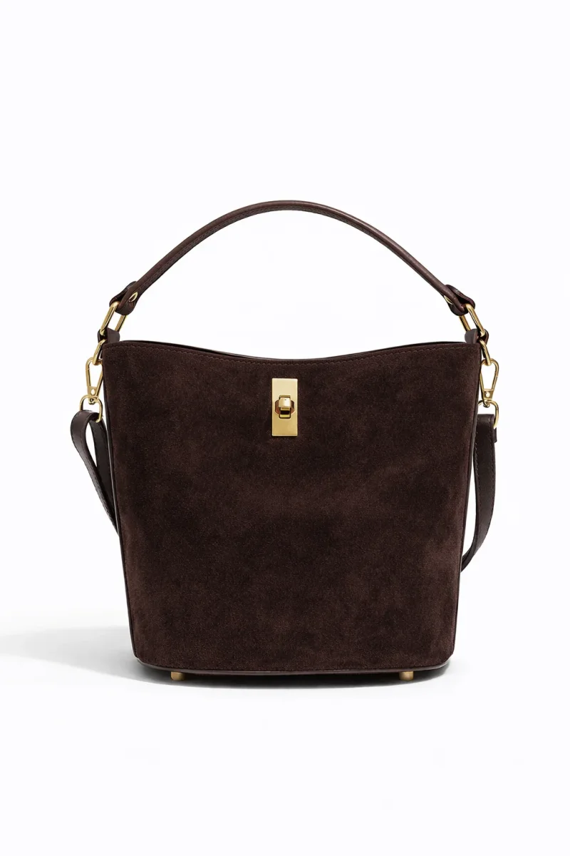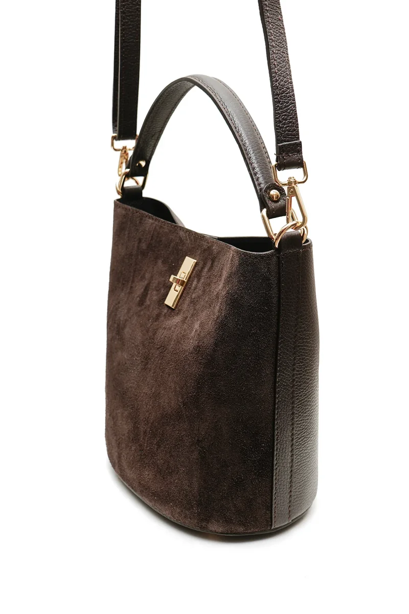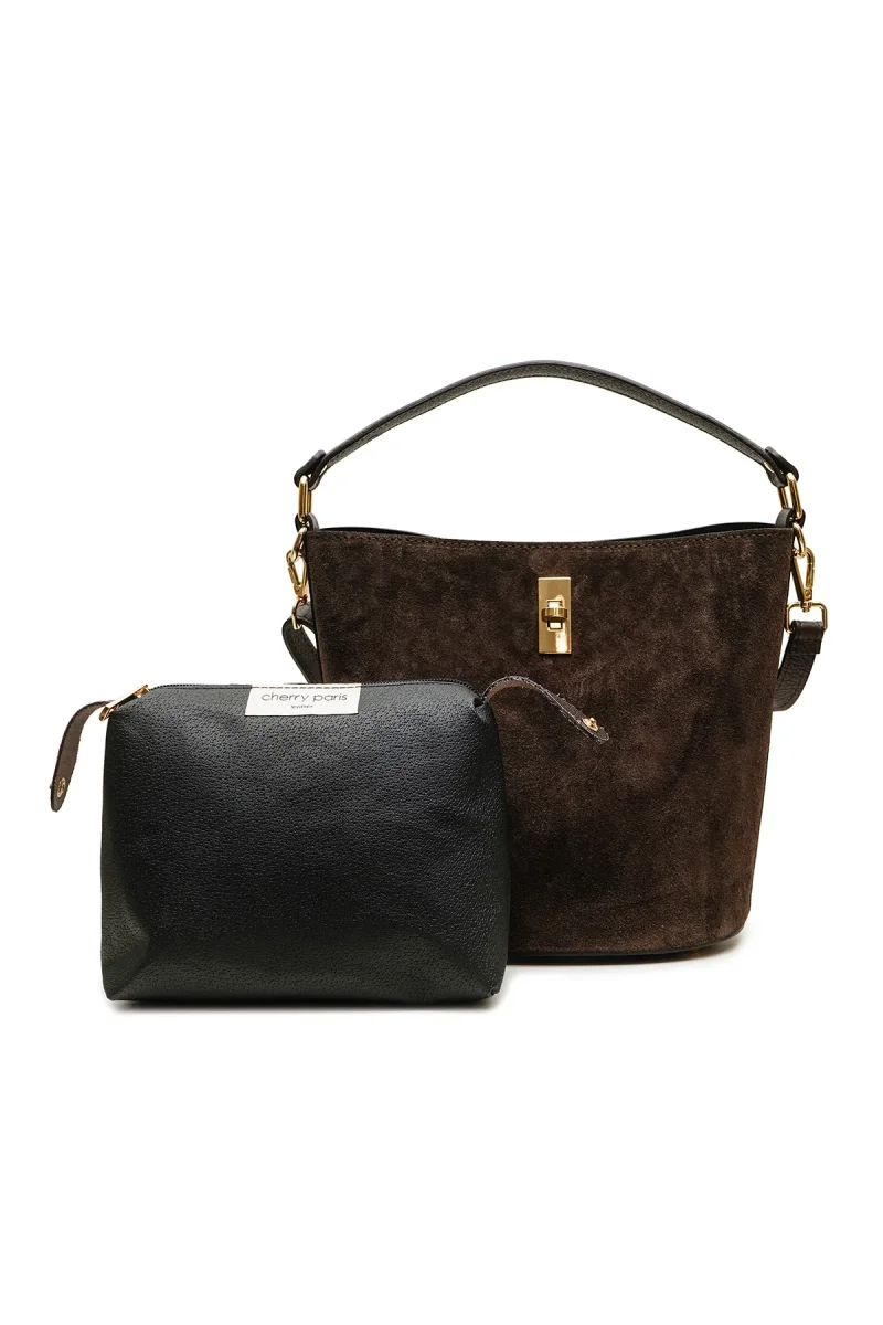 • Sac seau porté main et bandoulière en croûte de cuir de vachette suède et cuir de vachette grainé.