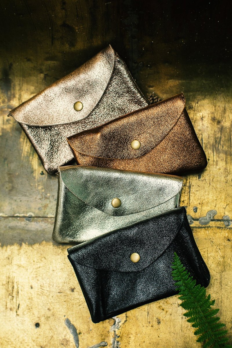 - Pochette, porte-monnaie en croûte de cuir de vachette métallisé.