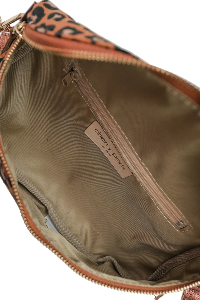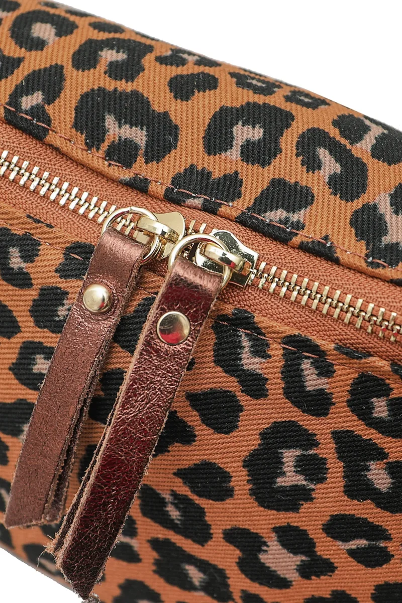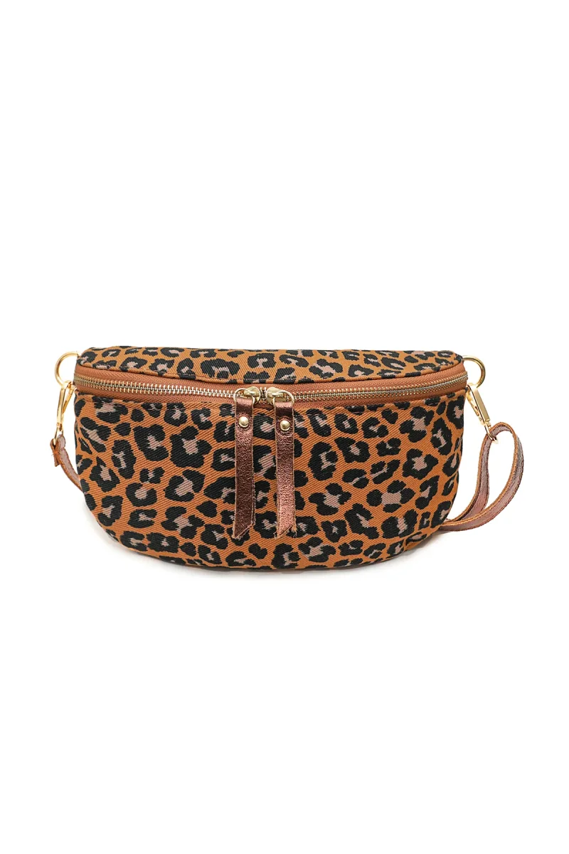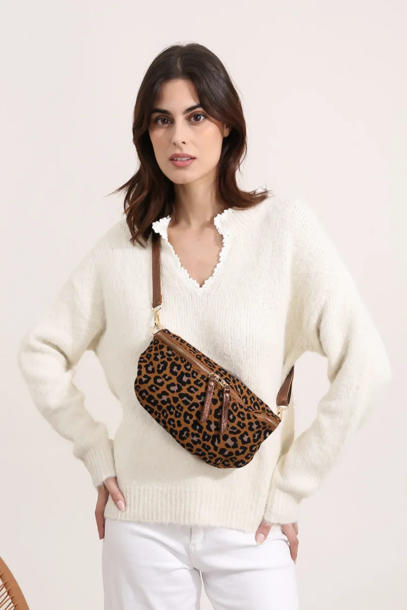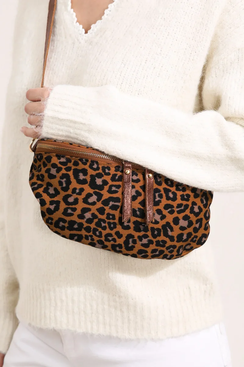 - Sac banane en textile léopard garni croûte de cuir de vachette métallisé.