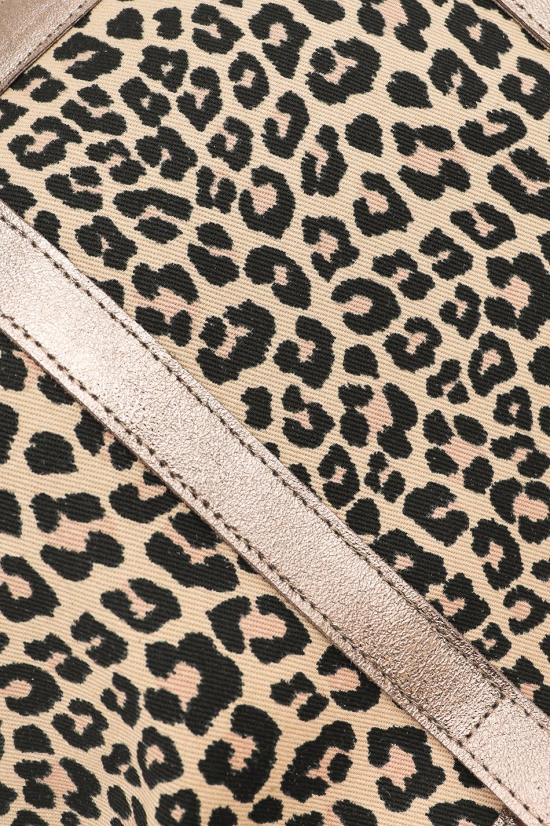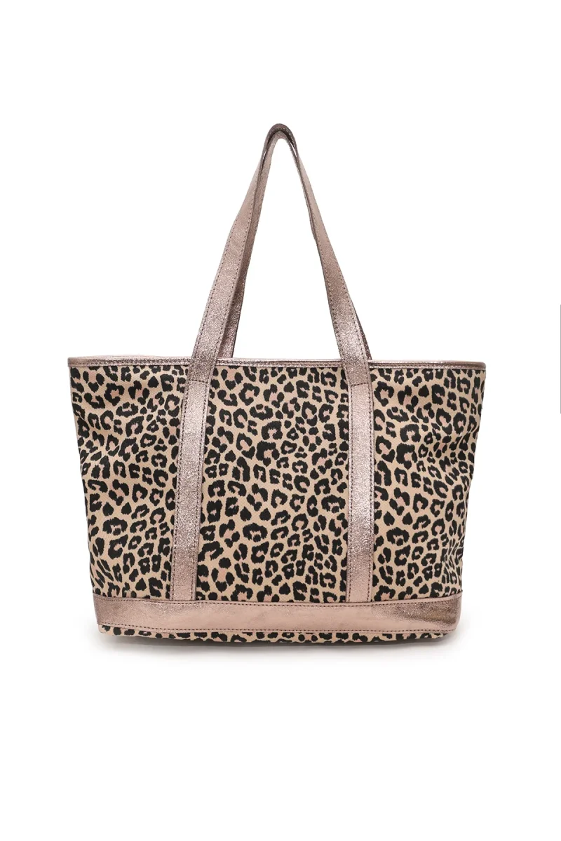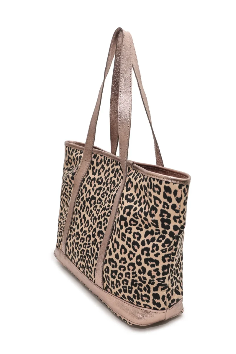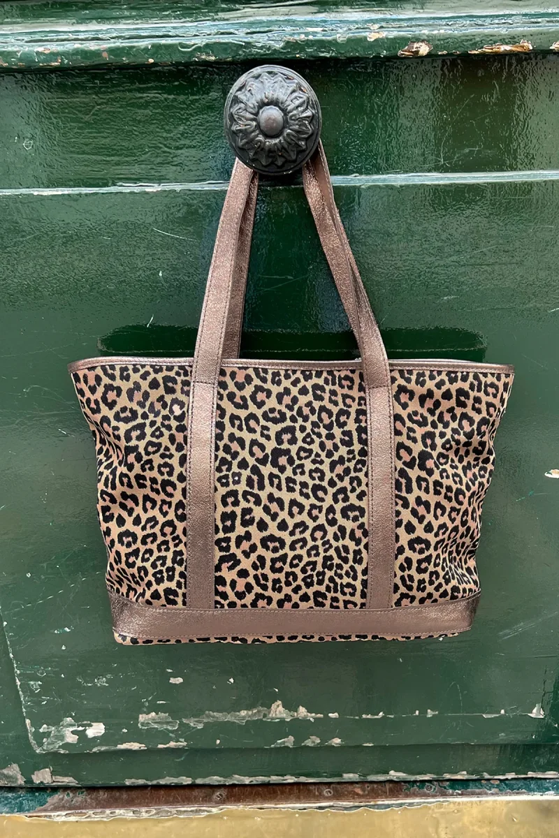 - Sac cabas en textile imprimé léopard garni croûte de cuir de vachette métallisé.