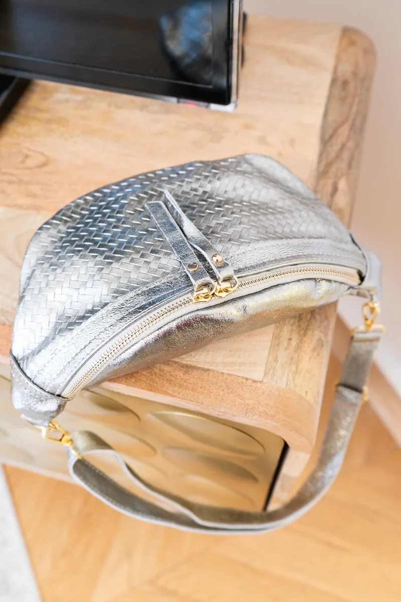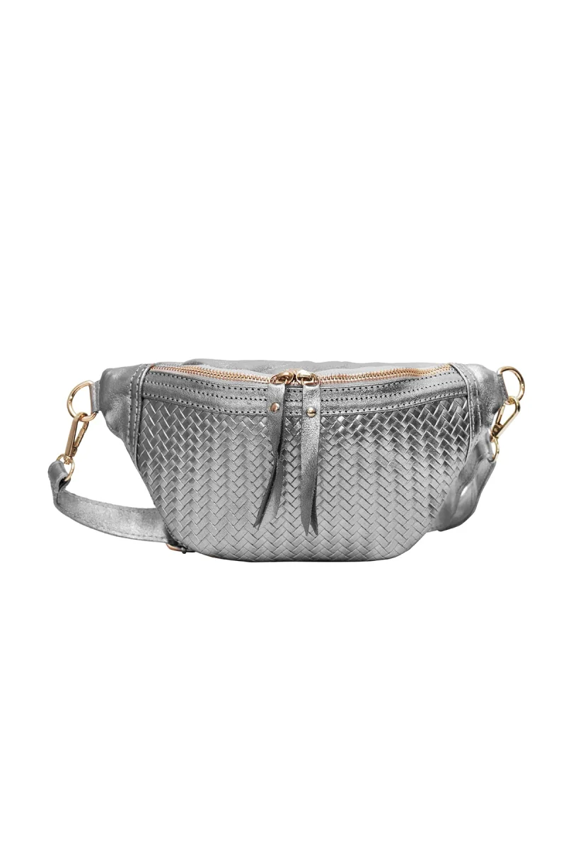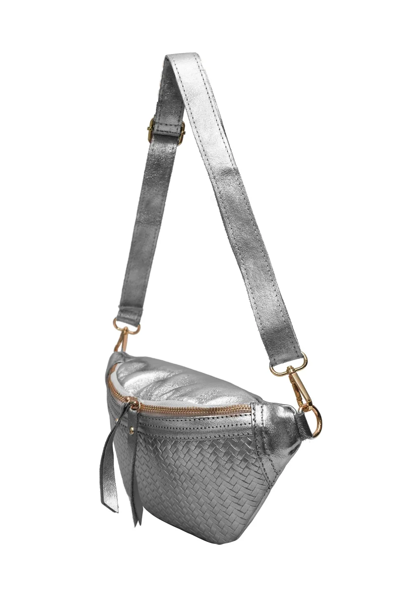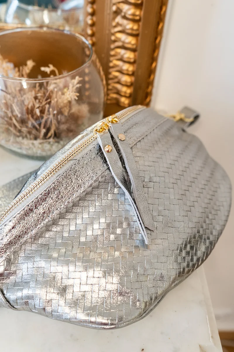 • Sac banane en croûte de cuir de vachette métallisé avec motif tressé.