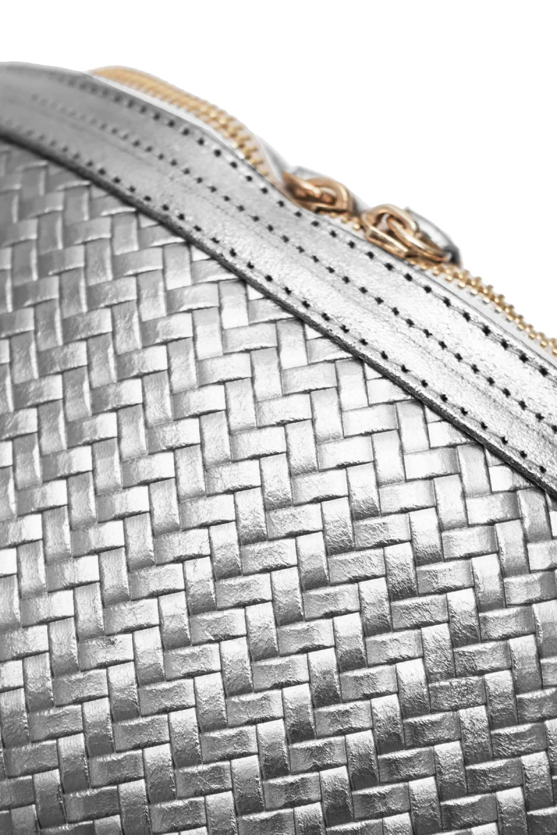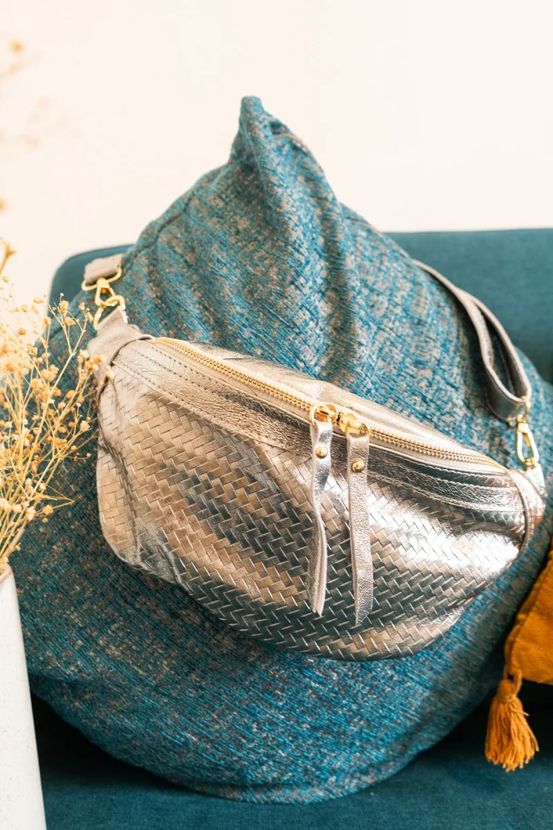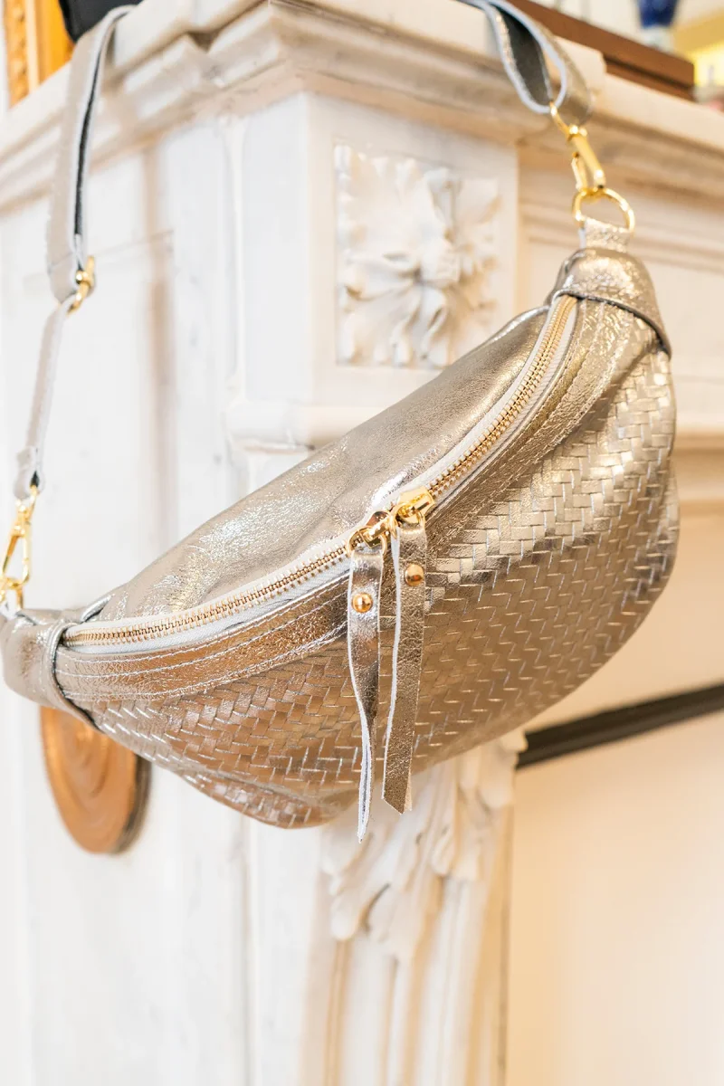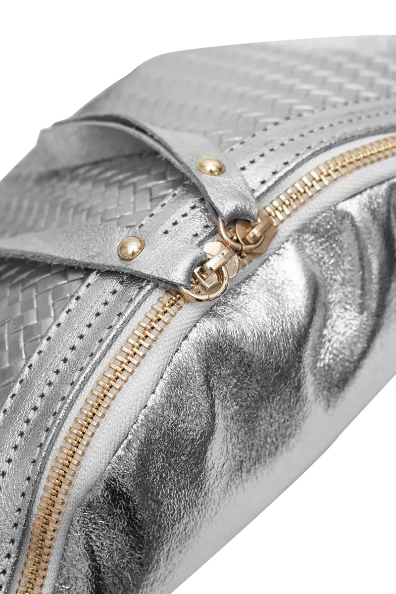 • Sac banane en croûte de cuir de vachette métallisé avec motif tressé.
