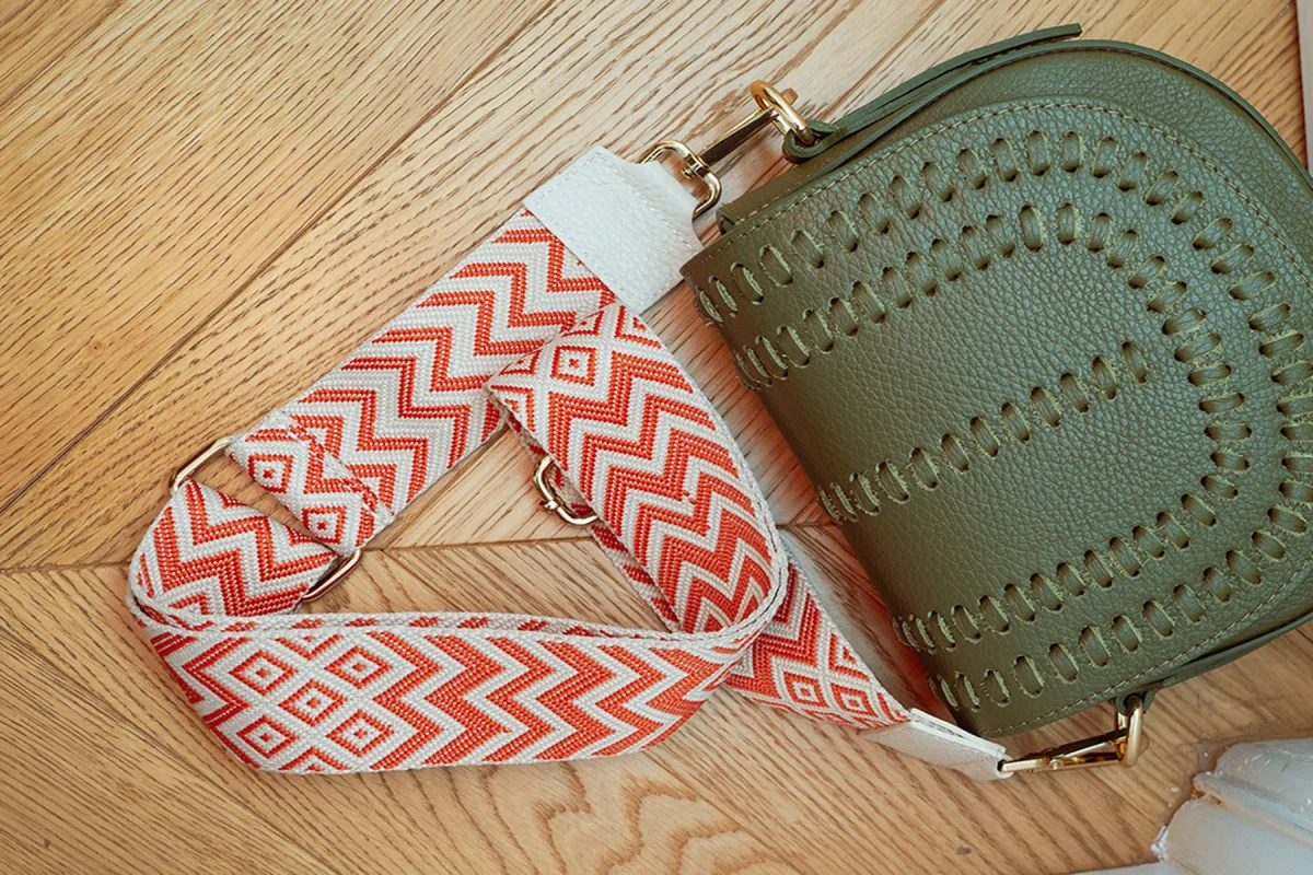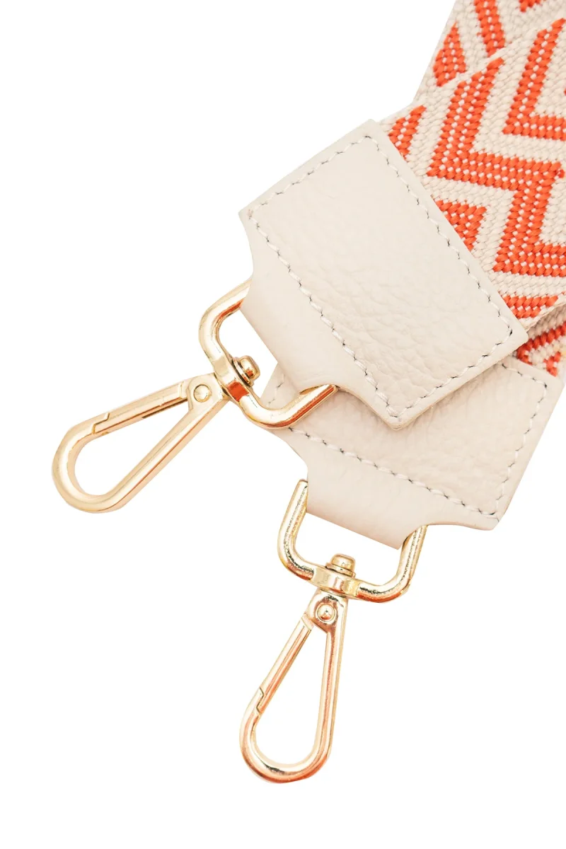 Sangle SALLY • sangle bandoulière en textile garnie en cuir de vachette grainé • largeur : 5 cm – longueur mini : 70 cm – max : 120 cm Détail précieux ✨ Son tissu coloré idéal pour agrémenter un sac MatièreLa sangle est composée de textile et de cuir