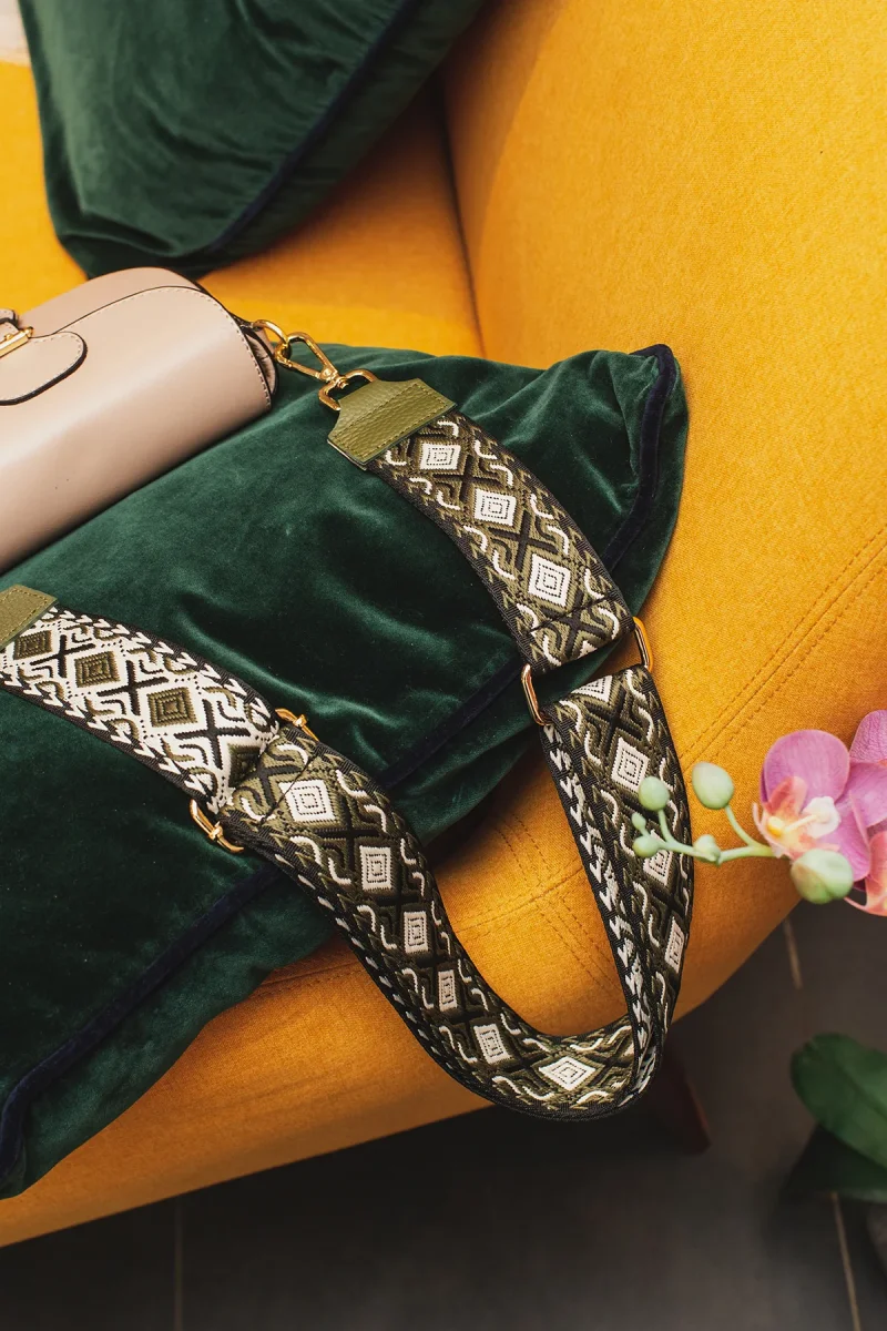 Sangle Yona • sangle bandoulière en textile garnie en cuir de vachette grainé • largeur : 5 cm – longueur mini : 70 cm – max : 120 cm Détail précieux ✨ Son tissu coloré idéal pour agrémenter un sac MatièreLa sangle est composée de textile et de cuir