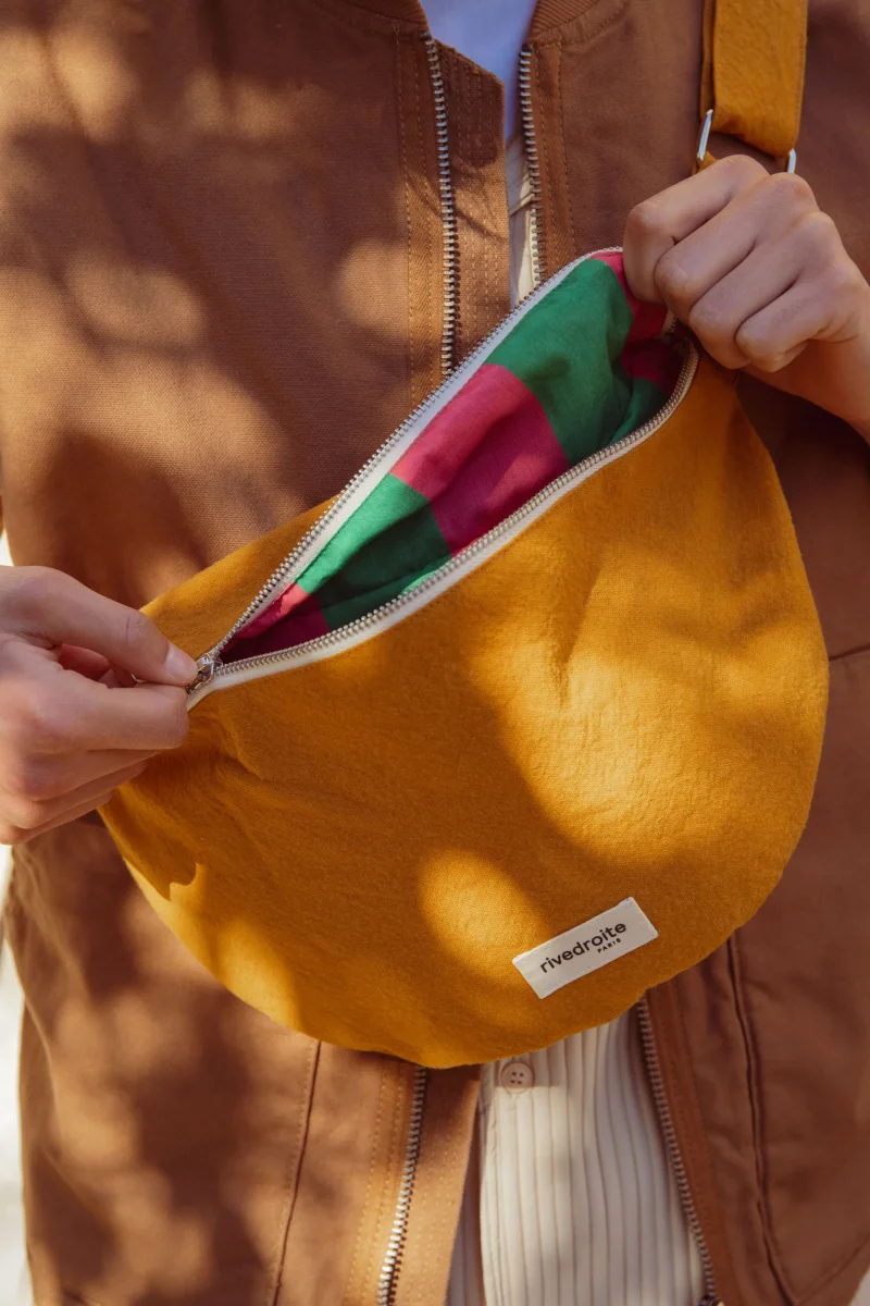 Ses doublures intérieures sont issues, comme toujours, de fins de stocks de tissus de l’industrie textile unies à qui on donne une seconde vie, sur lesquelles on a imprimé des rayures Médina Rose et Vert palmier pour encore plus de good vibes.