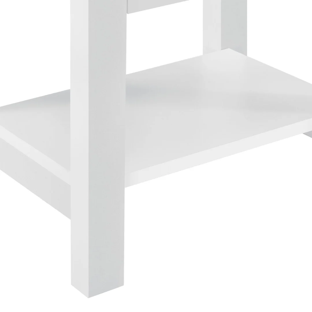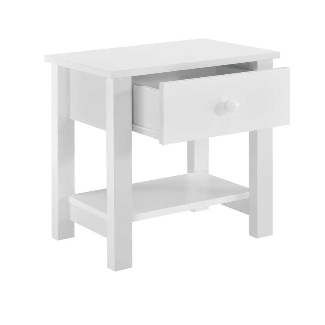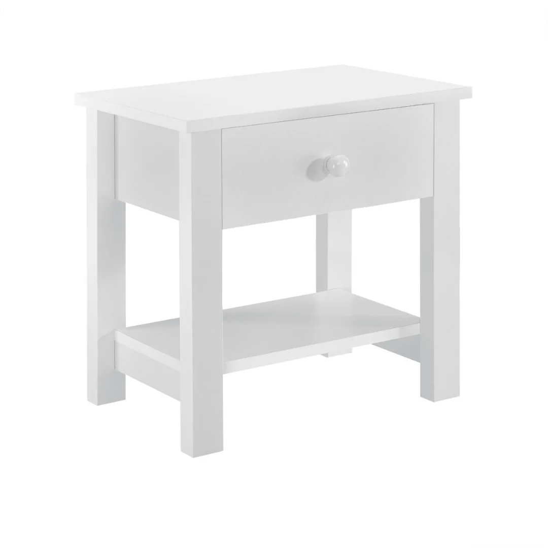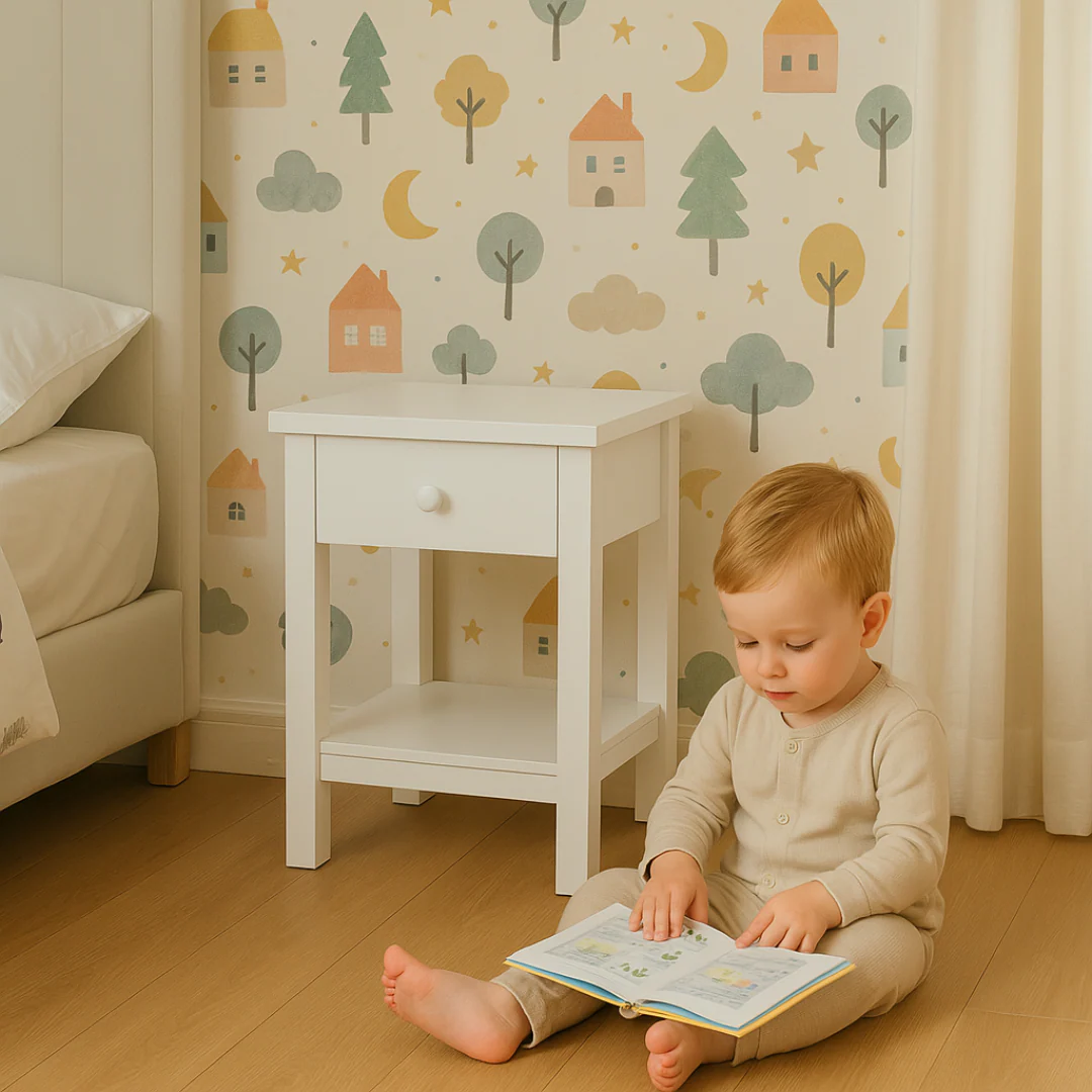 Petite, blanche, pratique : cette table de chevet a tout compris. Avec son tiroir discret et son de rangement bien pensé, elle garde à portée de main livres, doudous ou veilleuse.