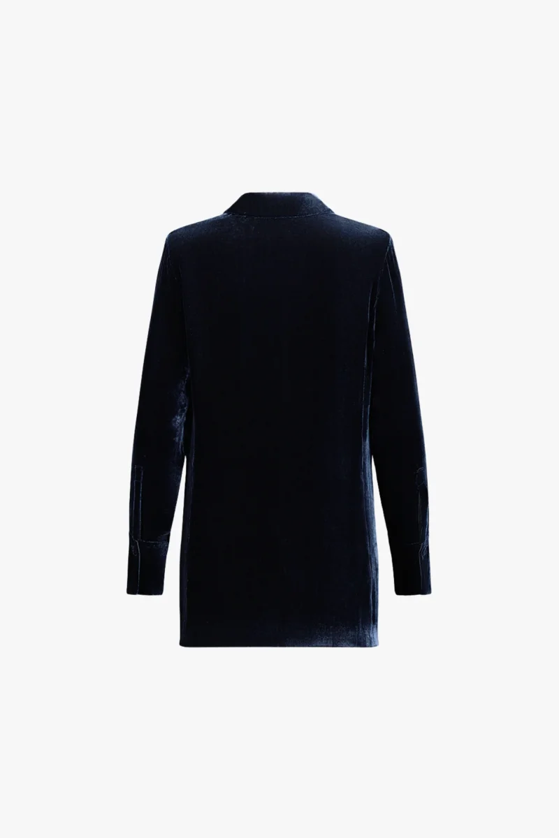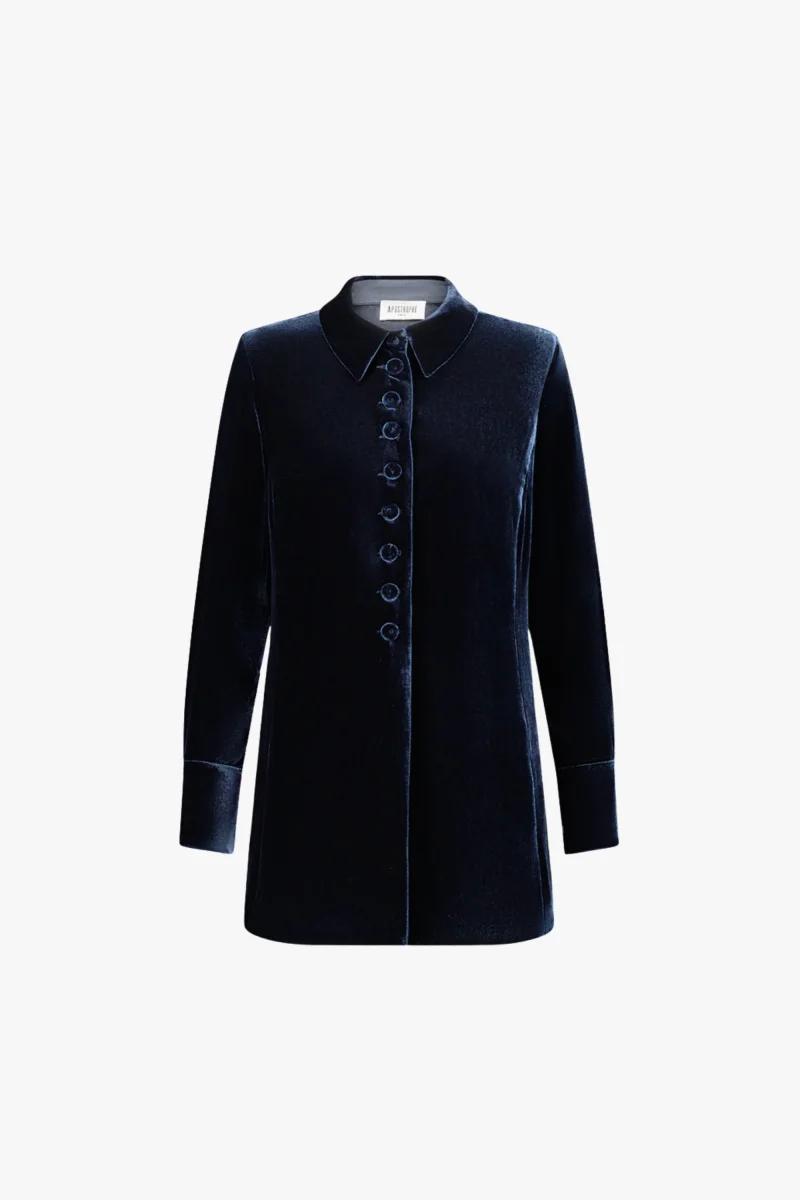 La matière capte la lumière avec retenue. En velours marine, cette chemise droite évoque la douceur d’un soir d’hiver, entre ombre et éclat. Son col structuré, ses boutons apparents et ses poignets marqués dessinent une allure subtile, presque graphique.