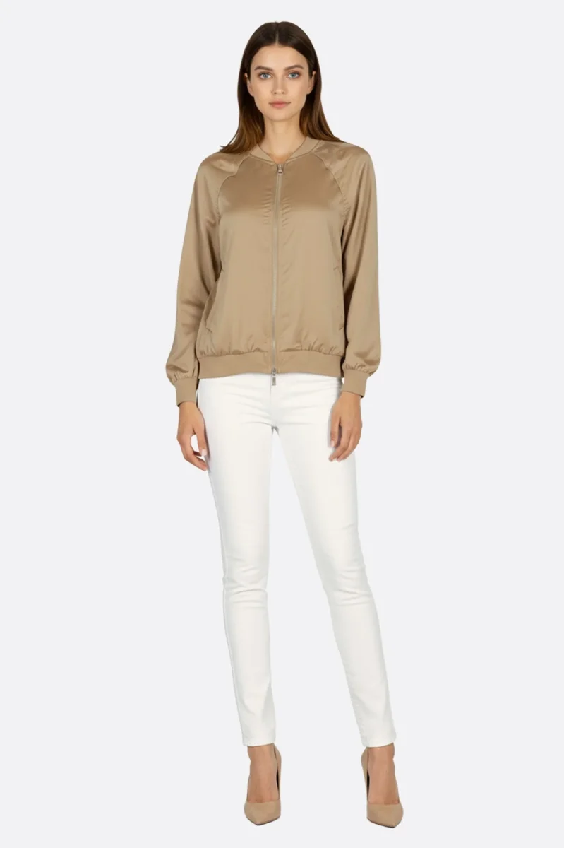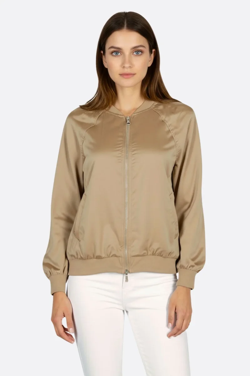 La maison Misciano a choisi un tissu satiné composé de 70% de viscose et 30% de polyamide pour sa douceur et son éclat subtil. La coupe bomber moderne, légèrement blousante, assure une silhouette équilibrée et élégante. La fermeture zippée ton sur ton et les poches latérales intégrées ajoutent une touche de minimalisme pratique. Les finitions bord-côte aux poignets et à la taille conçussent un maintien confortable, tandis que le tombant fluide du tissu accentue la légèreté de la veste.