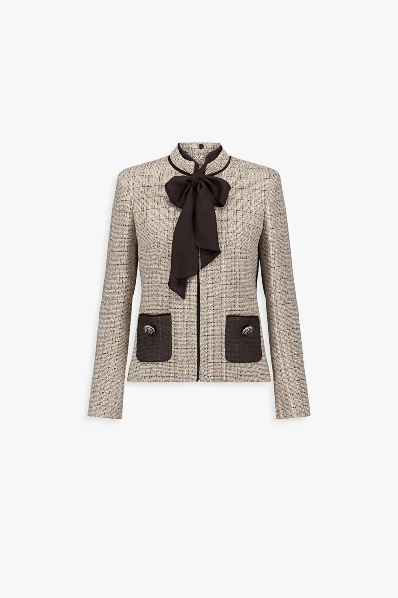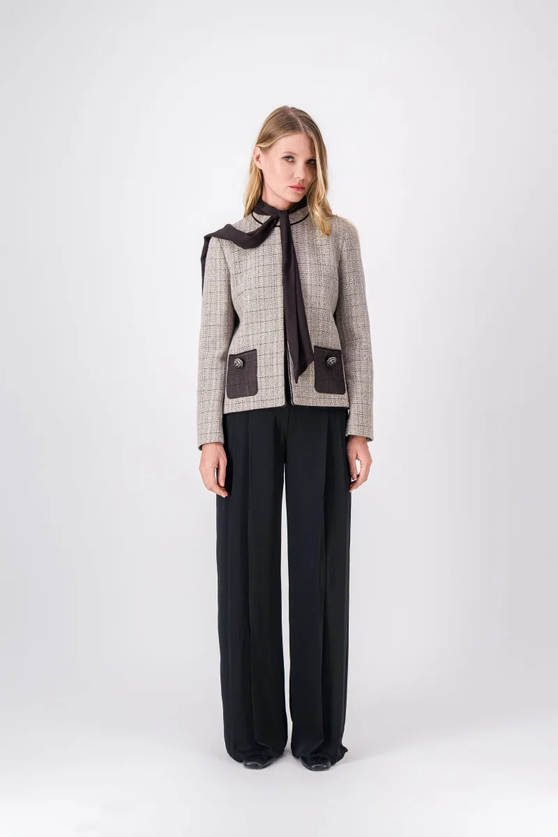 Cette veste courte à la coupe droite impose une allure sobre et maîtrisée. Son écharpe intégrée prolonge la ligne du col, ses poches passepoilées dessinent des finitions nettes et ses boutons ébène ponctuent l’ensemble d’un éclat subtil. Pensée pour traverser les mois froids avec distinction, elle s’associe facilement à des tenues habillées ou à des silhouettes plus décontractées.