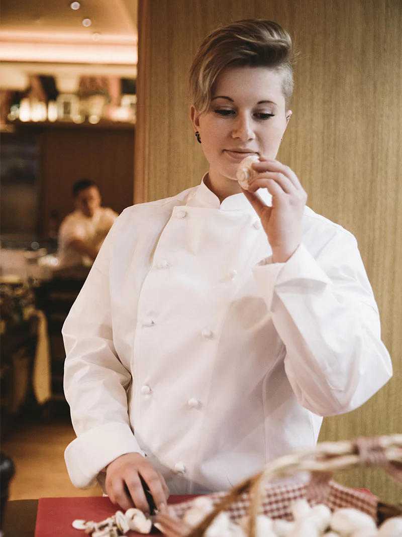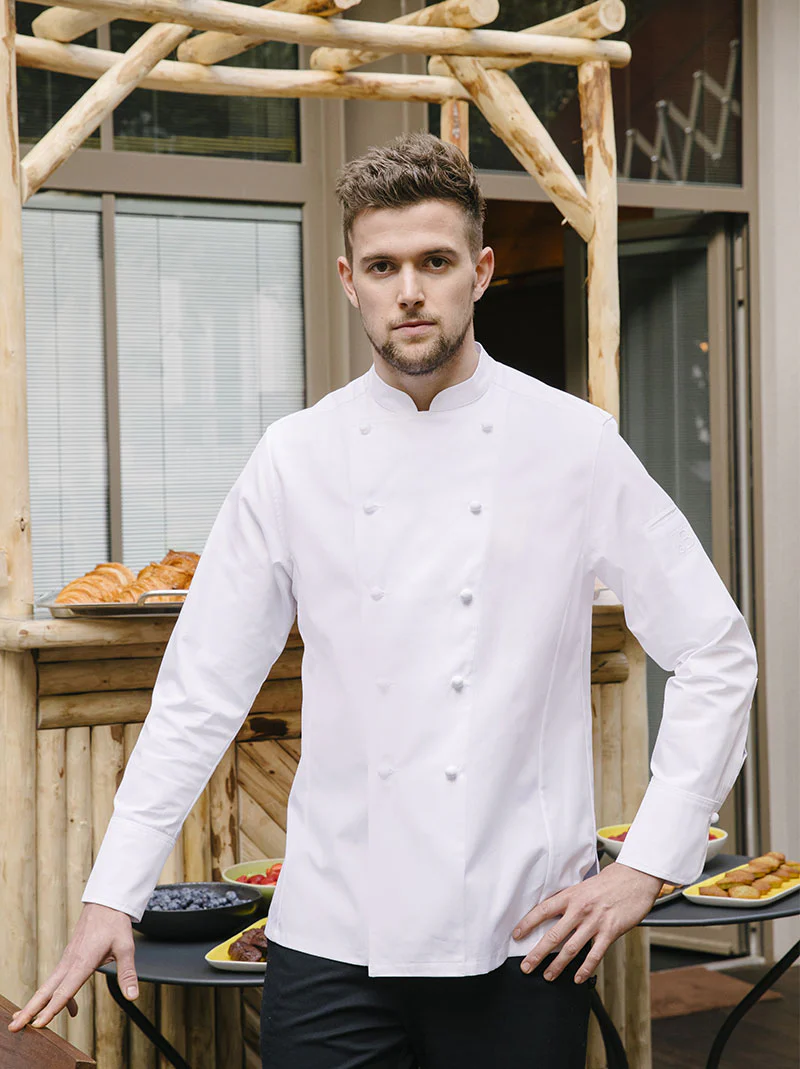 Combinaison parfaite entre une veste de cuisine double boutonnage et une chemise de haute couture.