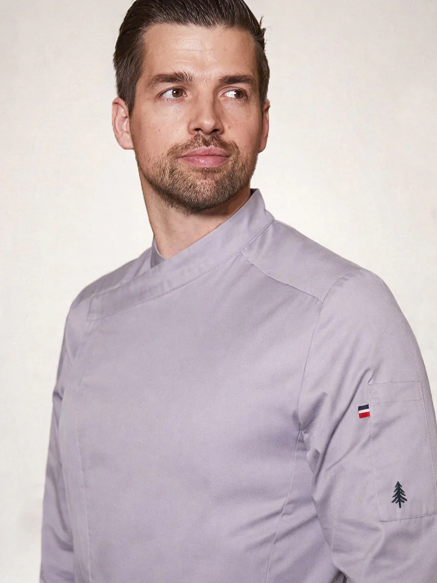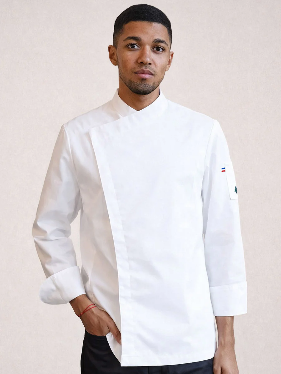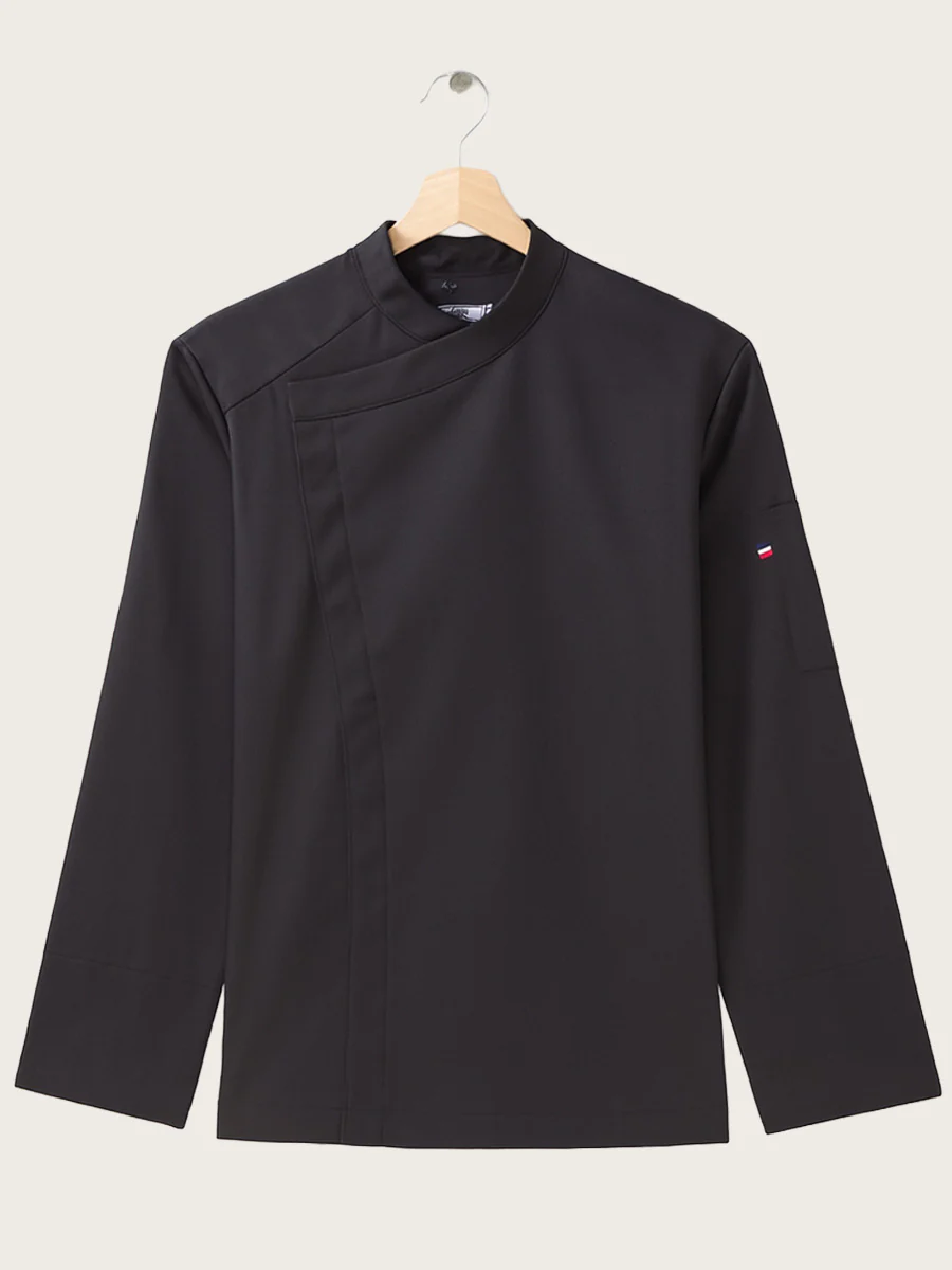 Veste de cuisine homme en polycoton avec fermeture asymétrique.