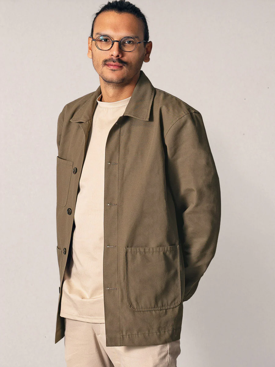 Veste de travail unisexe revisitée par notre atelier et fabriquée dans les tissus increvables de nos tabliers.Si vous vous hésitez entre 2 tailles, prenez la plus petite.Sur la veste kaki, Esteban mesure 186 cm et porte du M.[SHORTDESCRIPTION]Veste de travail unisexe.Tissu 100% coton tissé et teint dans les Vosges.3 poches extérieures et 1 poche intérieure […]