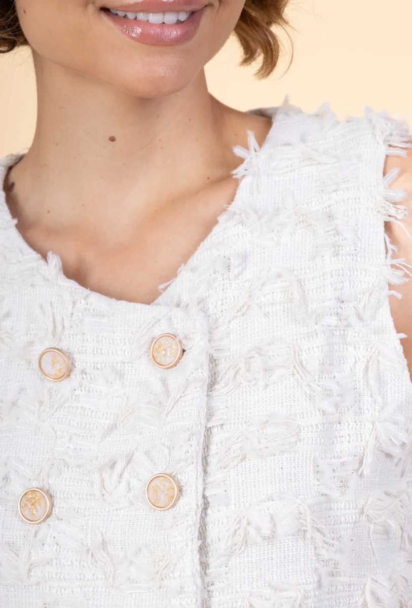 Veste Polly • Sans manches • Col rond • Fermeture par boutons • Double boutonnage • Boutons bijoux Matière & EntretienLa veste est composée à 80% de coton et 20% de polyamide.Préférez un lavage en machine à 30°, programme délicat.Séchage et repassage à faible température.Evitez le sèche linge !